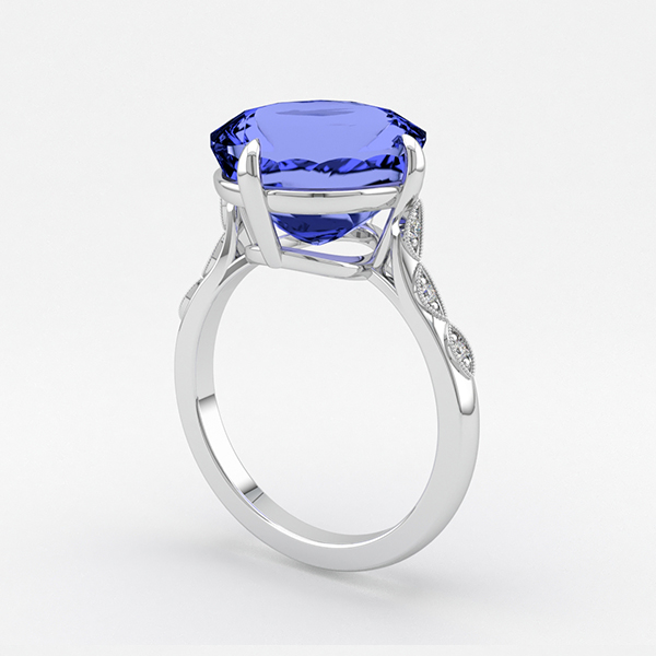 For its use with Ms. Paltrow’s ring, it provides a cooling element to the blue of the sapphire gemstone, adding to the depth and intensity of the stone’s hue. Small diamonds travel halfway down the shank adding to the shine and luster.