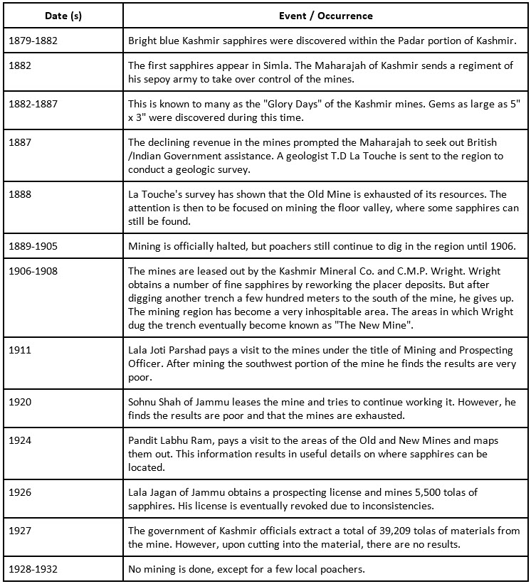 Kashmir sapphires descend from a remote part of the Himalaya Mountains known as the Zanskar range. The mines located in the Zanskar range while widely known for bright, blue sapphires, also have been known to produce . When the Maharaja of Kashmir heard of the presence of the bright blue beautiful sapphires, he posted guards outside of the mines to protect their value. From the year 1882 to 1887, the mines were worked day and night throughout the summer months until the mines were depleted.