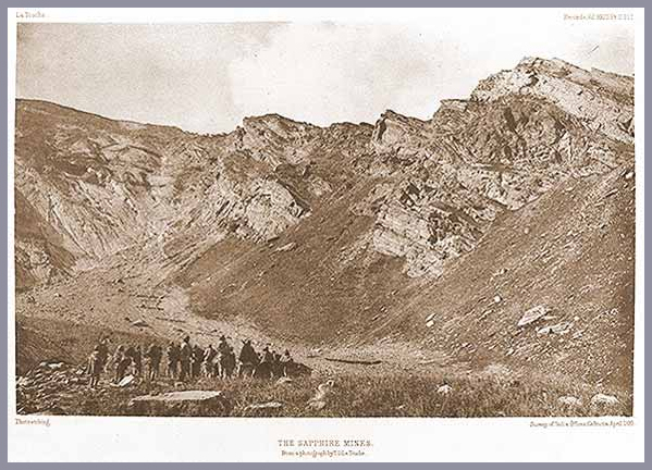 To access the mine, the beginning journey is quite dangerous and challenging. The journey started by traveling over the Chinab and Wardwan River to cross a rope bridge which was elevated 11,550 ft in the mountains. The Chinab River ran through deep and quite narrow canyons which made traveling even more difficult. This portion of the travel took 5 days, even though it was only 24 miles long. The mines have been worked many times since these dates, but few sapphires have been produced as a result.
