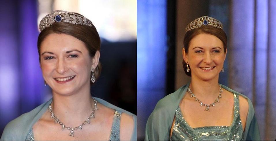 The parure is considered one of the most beautiful displays ever of jewelry craftsmanship and also one of the most complete, containing a tiara, necklace, earrings, brooch and four hairpins, two of which have been incorporated into earrings since the original earrings were supposedly separated from the set. The tiara itself consists of 11 separate sections, which means it can be worn in virtually any form, from a diadem to a crown, and adjusted to perfectly fit the shape of the wearer’s head. The tiara showcases 11 large, rectangular-shaped deep-blue sapphires set on a base of honeysuckles and leaves crafted from 11 oval-shaped diamonds and hundreds of smaller diamonds. As another testament to its remarkable design, the sapphires can be switched out for other gemstones. We can certainly see the new princess favoring a transformable tiara such as this that can travel the world and be worn to a variety of social events.