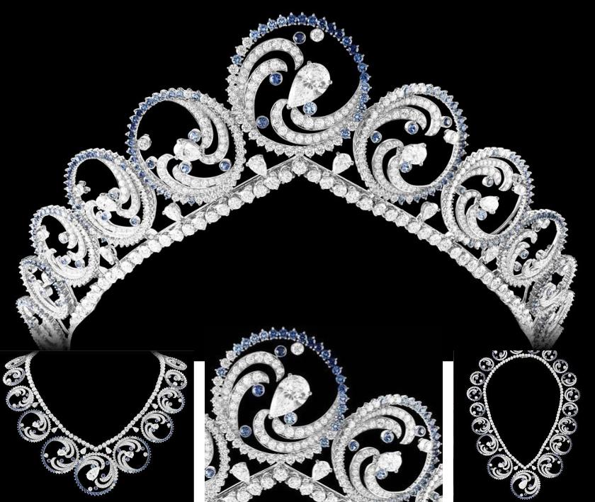 The newest sapphire tiara among our list of favorites is the Océan Tiara, commissioned by Prince Albert II of Monaco as one of several wedding gifts for his new bride, Princess Charlene Wittstock. Created by renowned jeweler Van Cleef & Arpels, the tiara pays homage to Charlene’s South African heritage as well as her status as an Olympic swimmer. Its design features a sea-spume motif fashioned from more than 850 diamonds of the highest quality and 359 sapphires in graduated shades of blue evoking the different seas of the world, from the waters off the coast of Monaco to the ocean around South Africa. To crown the work, 11 pear-shaped diamonds represent water droplets. The largest of these, at more than four carats, is of incomparable beauty, with D color and an internally flawless clarity. What’s even more remarkable about this piece is that the tiara doubles as a necklace and also features removable elements that can be worn separately. We would love for the new princess to have a custom tiara such as this to match her unique personality.