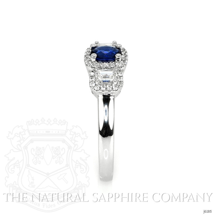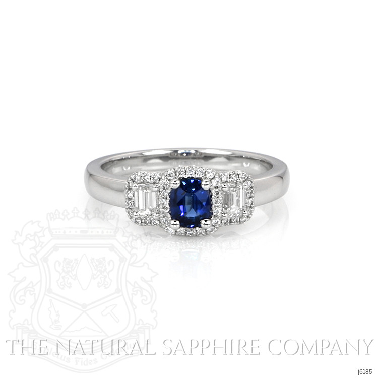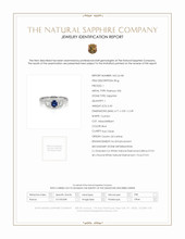The ring primarily features a beautiful, transparent 0.40 carat cushion shape blue sapphire with the dimensions of 4.71 x 3.81 x 2.49 mm and is mixed brilliant cut. It has a clarity grade of eye clean (evaluated at eye level), vivid color intensity, and an excellent polish. The origin of this sapphire is Ceylon (Sri Lanka). Featured in the ring are 2 white emerald cut shaped emerald cut natural diamonds, weighing a total of 0.28 carats. The natural diamonds have a clarity grade of vs1 - Very Slightly Included., F color Also featured in the ring are 40 white round shaped brilliant cut natural diamonds, weighing a total of 0.11 carats. The natural diamonds have a clarity grade of vs1 - Very Slightly Included., F color The ring is entirely set in platinum 950.