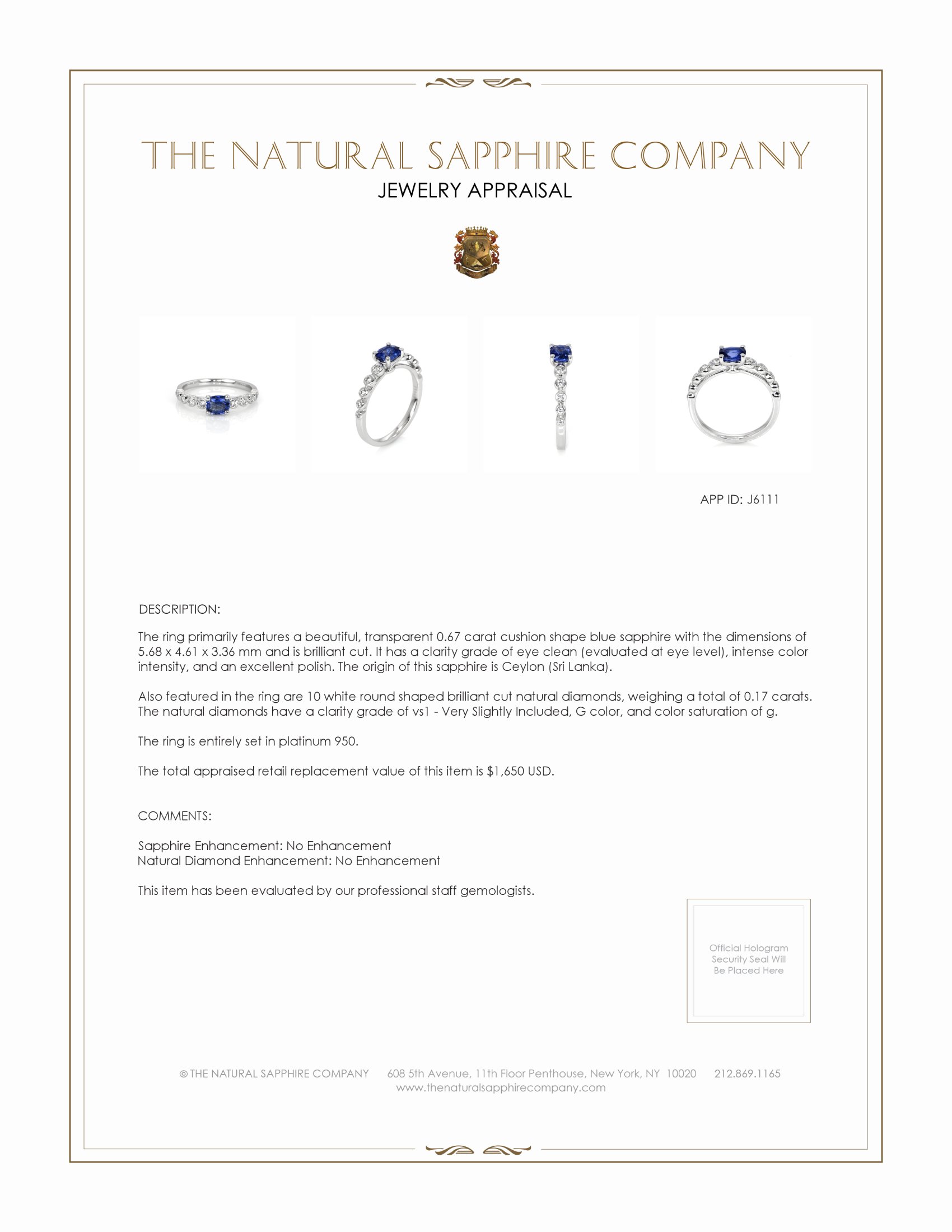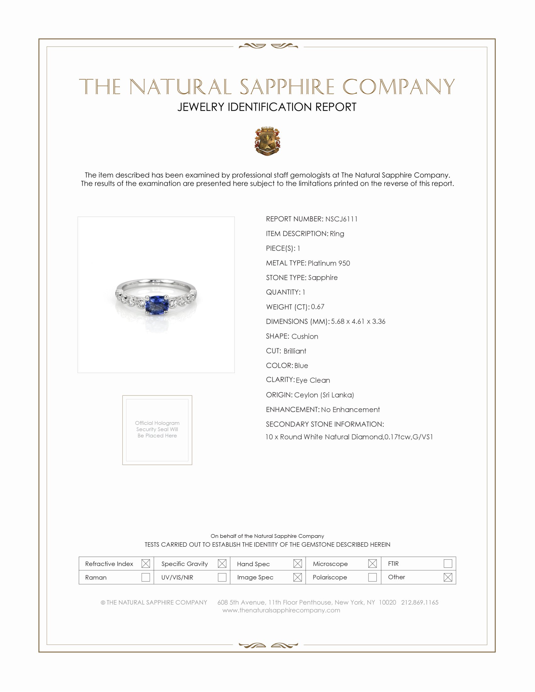 The ring primarily features a beautiful, transparent 0.67 carat cushion shape blue sapphire with the dimensions of 5.68 x 4.61 x 3.36 mm and is brilliant cut. It has a clarity grade of eye clean (evaluated at eye level), intense color intensity, and an excellent polish. The origin of this sapphire is Ceylon (Sri Lanka). Also featured in the ring are 10 white round shaped brilliant cut natural diamonds, weighing a total of 0.17 carats. The natural diamonds have a clarity grade of vs1 - Very Slightly Included, G color, and color saturation of g. The ring is entirely set in platinum 950.