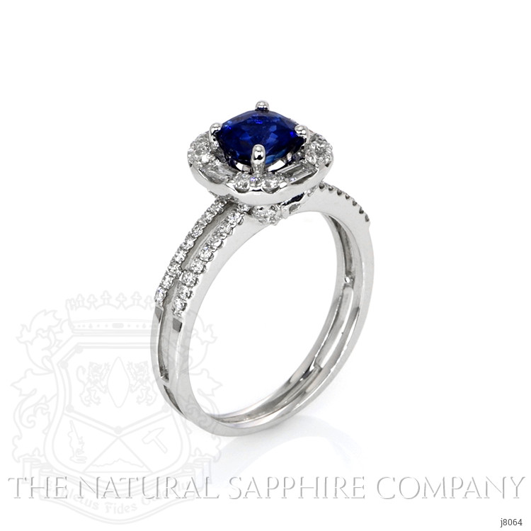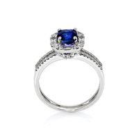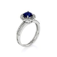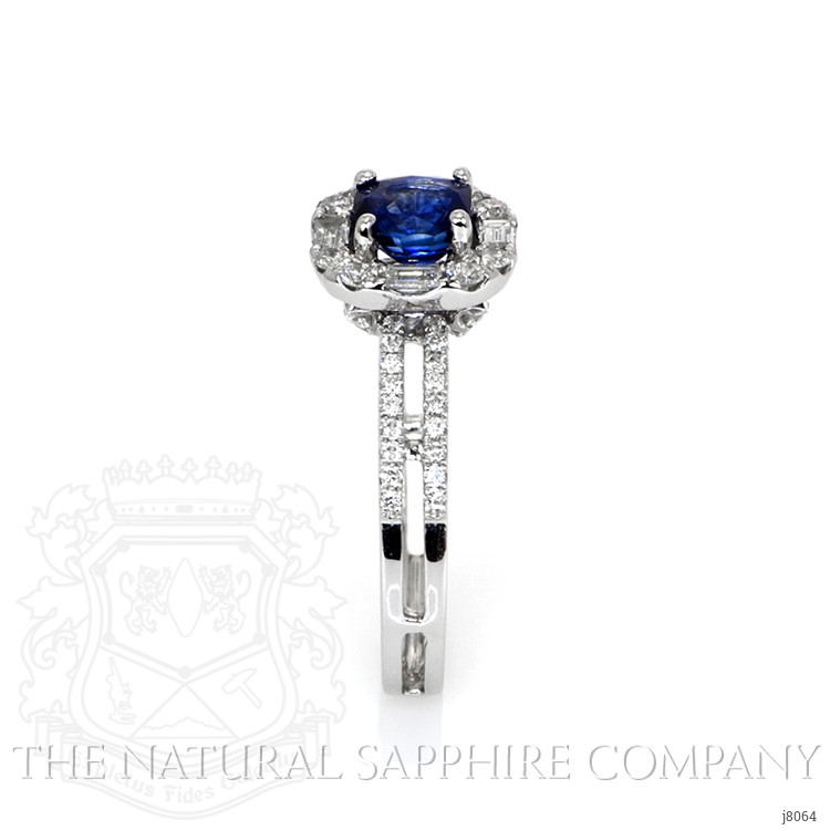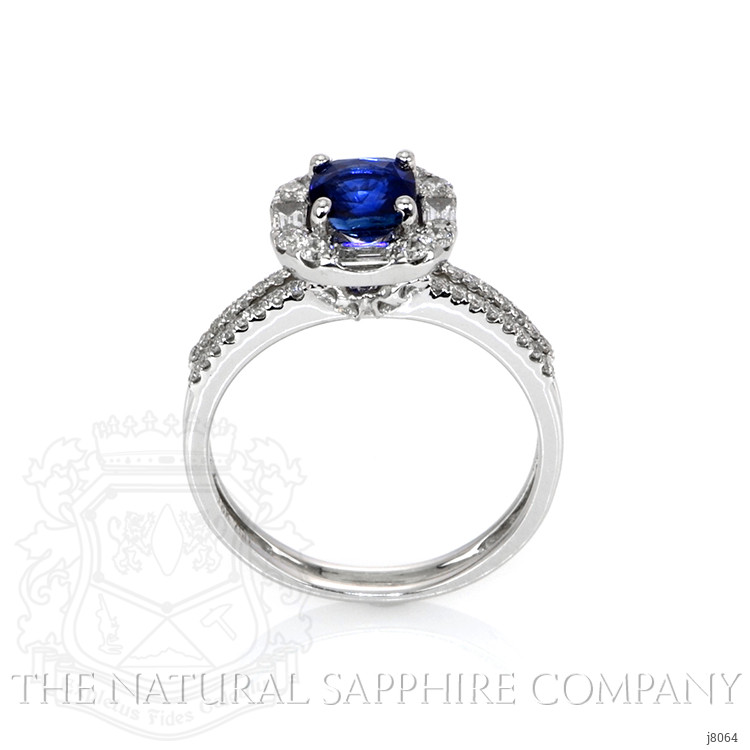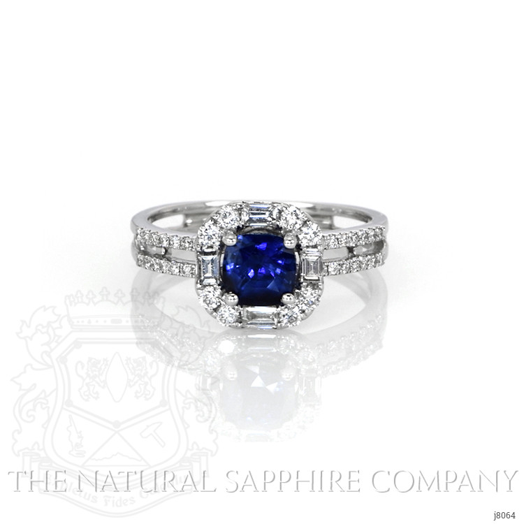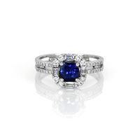 The ring primarily features a beautiful, transparent 0.80 carat cushion shape blue sapphire with the dimensions of 6.00 x 5.65 x 4.87 mm and is mixed brilliant cut. It has a clarity grade of eye clean (evaluated at eye level), vivid color intensity, and an excellent polish. The origin of this sapphire is Ceylon (Sri Lanka). Featured in the ring are 4 white baguette (straight) shaped step cut natural diamonds, weighing a total of 0.24 carats. The natural diamonds have a clarity grade of vvs1 - Very Very Slightly Included., F color Also featured in the ring are 40 white round shaped brilliant cut natural diamonds, weighing a total of 0.33 carats. The natural diamonds have a clarity grade of vvs1 - Very Very Slightly Included., F color The ring is entirely set in 18K white gold.