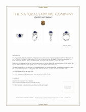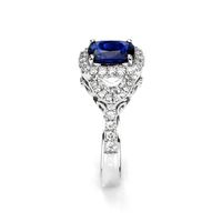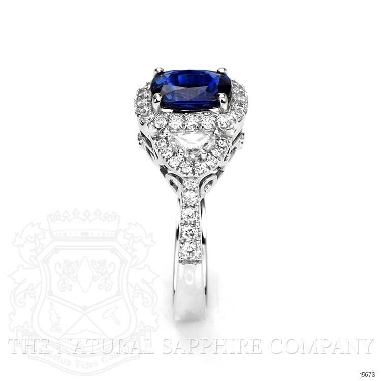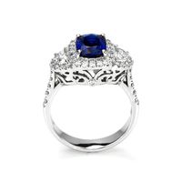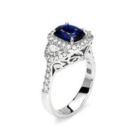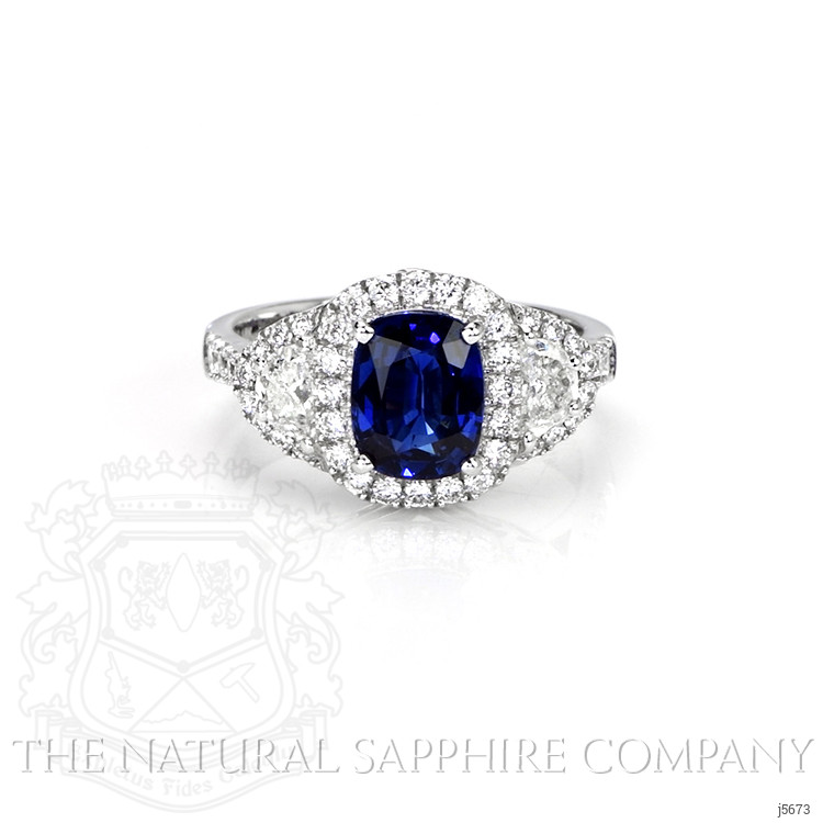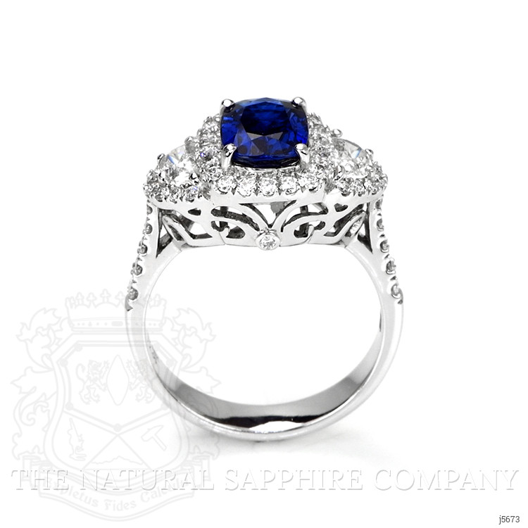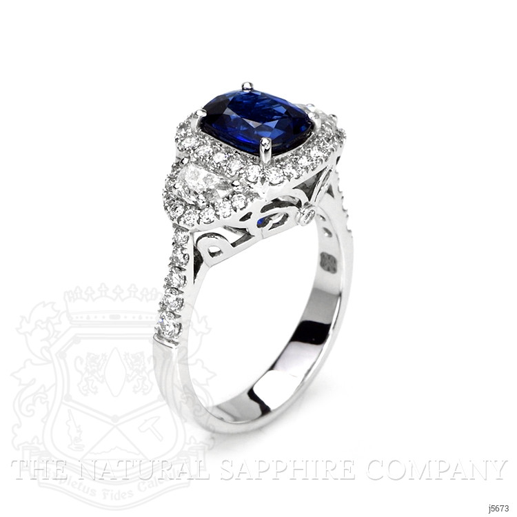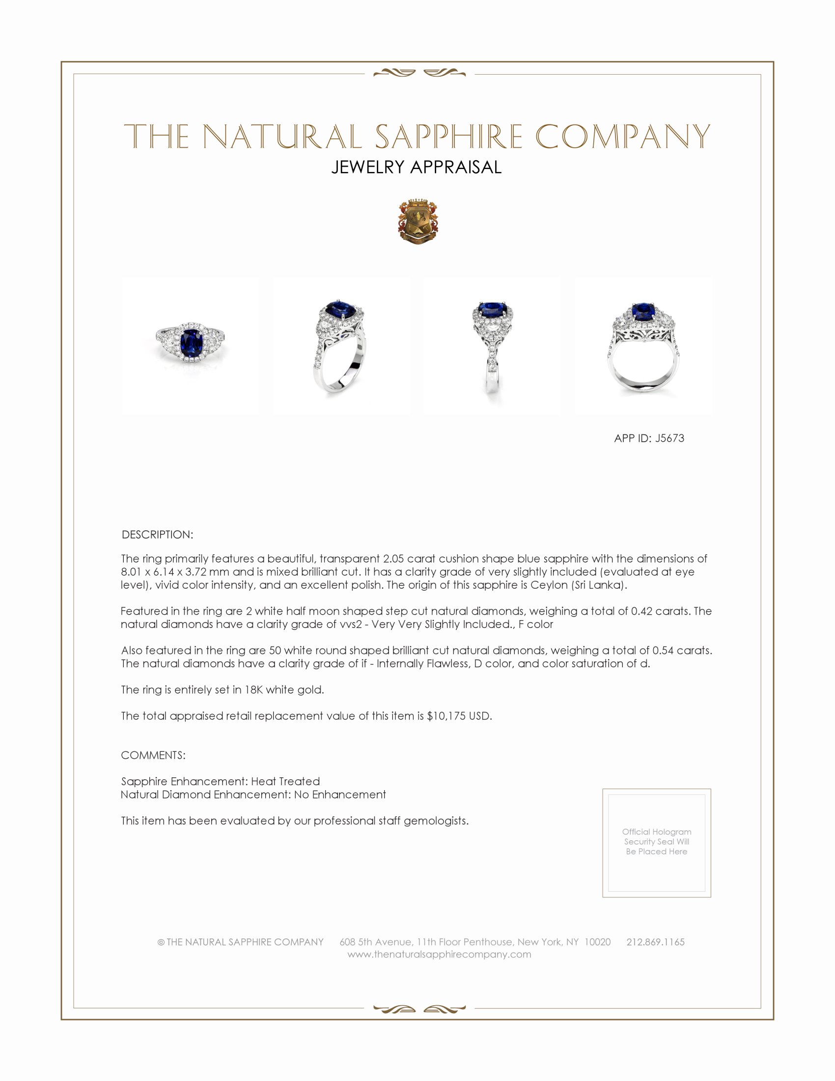 The ring primarily features a beautiful, transparent 2.05 carat cushion shape blue sapphire with the dimensions of 8.01 x 6.14 x 3.72 mm and is mixed brilliant cut. It has a clarity grade of very slightly included (evaluated at eye level), vivid color intensity, and an excellent polish. The origin of this sapphire is Ceylon (Sri Lanka). Featured in the ring are 2 white half moon shaped step cut natural diamonds, weighing a total of 0.42 carats. The natural diamonds have a clarity grade of vvs2 - Very Very Slightly Included., F color Also featured in the ring are 50 white round shaped brilliant cut natural diamonds, weighing a total of 0.54 carats. The natural diamonds have a clarity grade of if - Internally Flawless, D color, and color saturation of d. The ring is entirely set in 18K white gold.