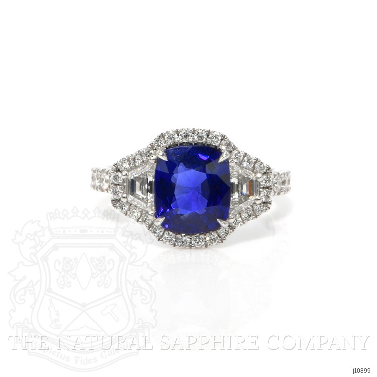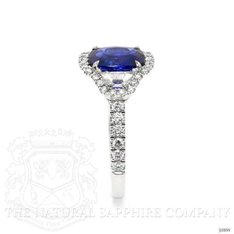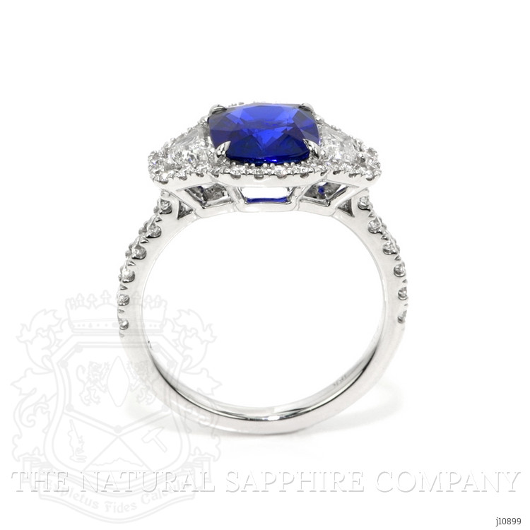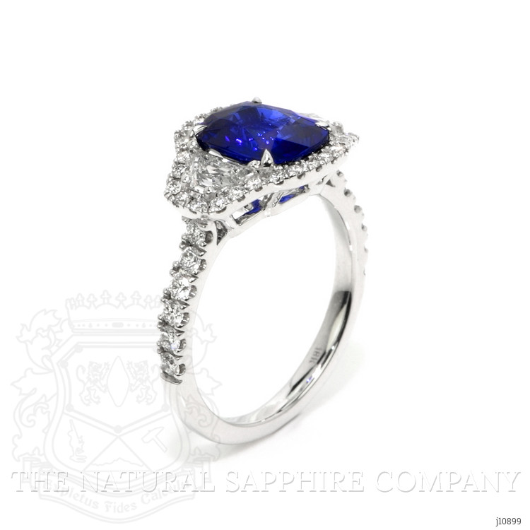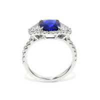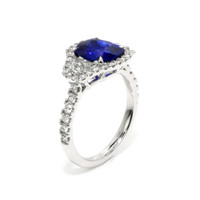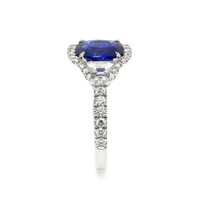 Encircling the sapphire is a halo of brilliant diamonds—each meticulously selected to enhance and celebrate the centerpiece. These luminous pavé-set stones capture and reflect the light onto the sapphire, amplifying its brilliance and offering an interplay of fire and ice that is as spectacular as it is unforgettable. The shank of the ring presents a continuation of this luxurious motif, adorned with diamonds that evoke a river of shimmering light, a sublime testament to the harmony of contemporary aesthetics and classical beauty, designed to stand the test of time.