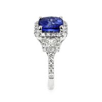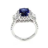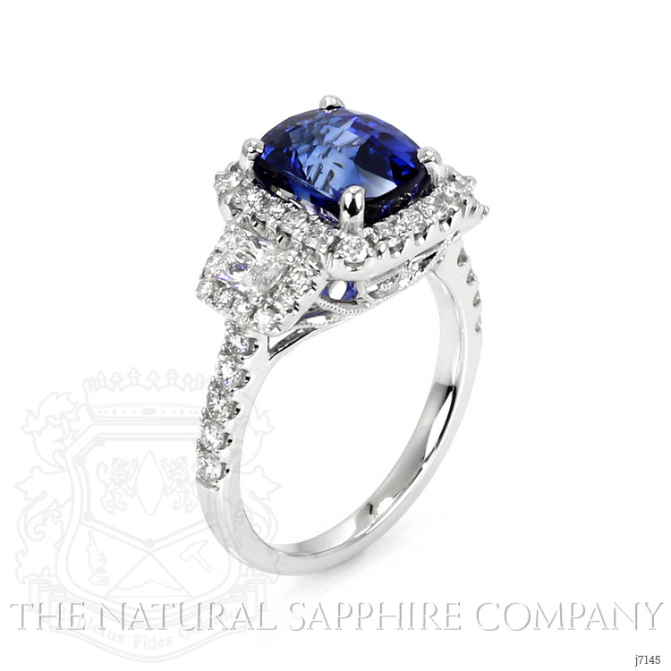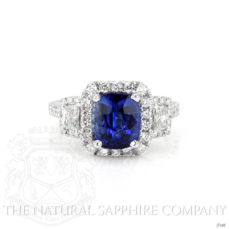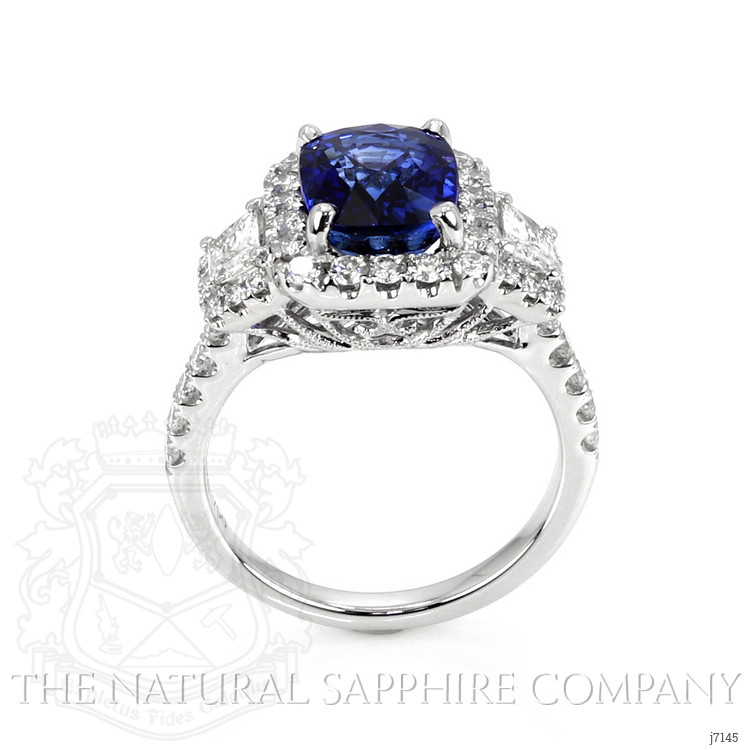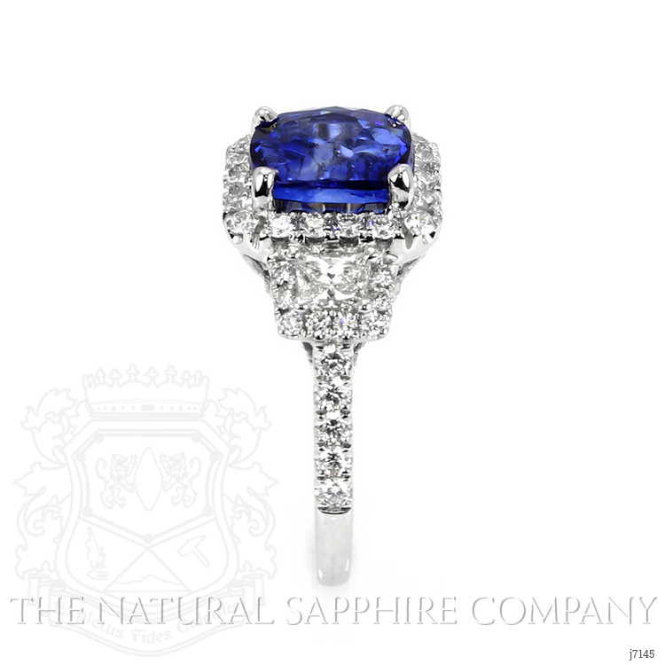 The ring primarily features a beautiful, transparent 3.68 carat cushion shape blue sapphire with the dimensions of 8.85 x 7.60 x 3.50 mm and is mixed brilliant cut. It has a clarity grade of eye clean (evaluated at eye level), vivid color intensity, and an excellent polish. The origin of this sapphire is Ceylon (Sri Lanka). Featured in the ring are 2 white trapezoid shaped brilliant cut natural diamonds, weighing a total of 0.50 carats. The natural diamonds have a clarity grade of vs2 - Very Slightly Included., F color Also featured in the ring are 44 white round shaped brilliant cut natural diamonds, weighing a total of 0.62 carats. The natural diamonds have a clarity grade of vs2 - Very Slightly Included., F color The ring is entirely set in 18K white gold.