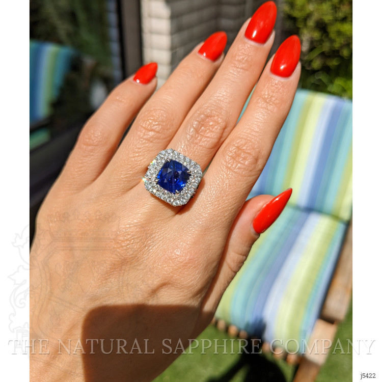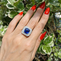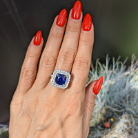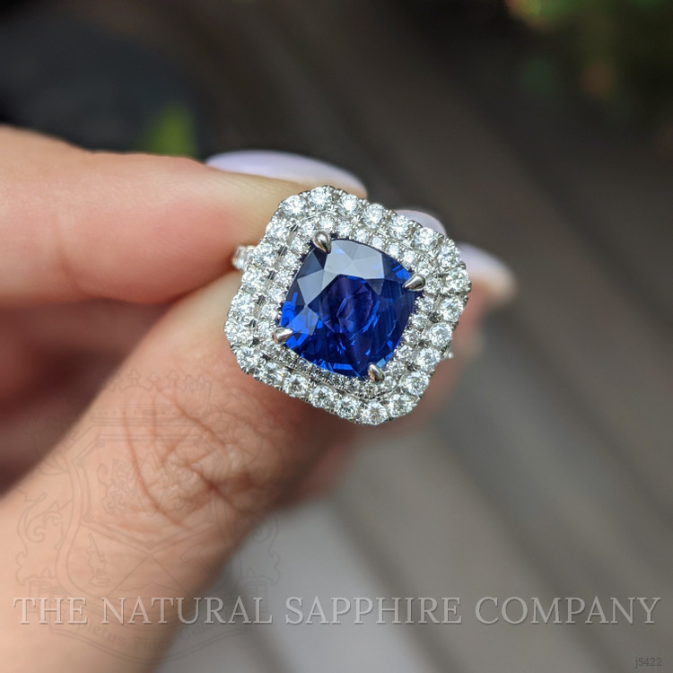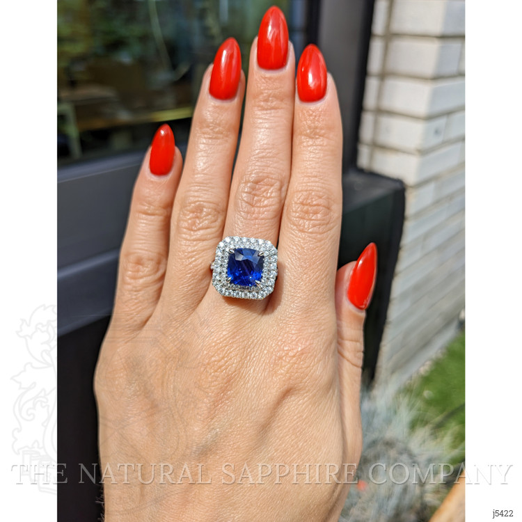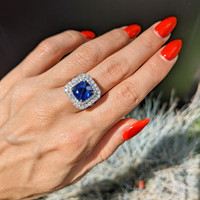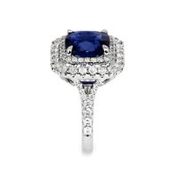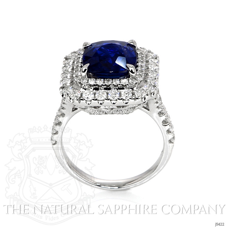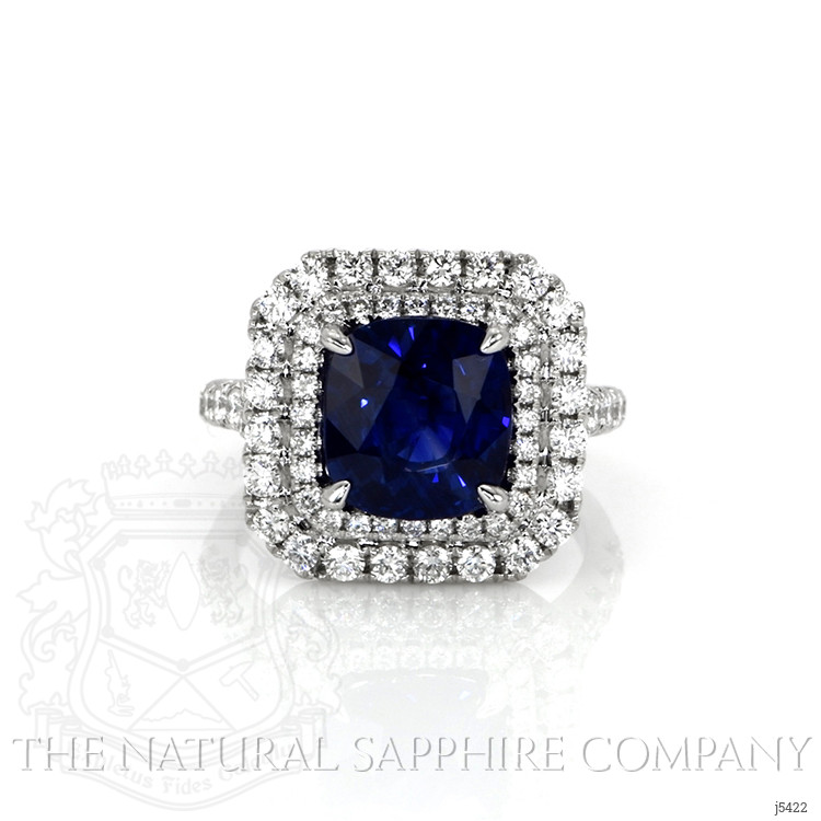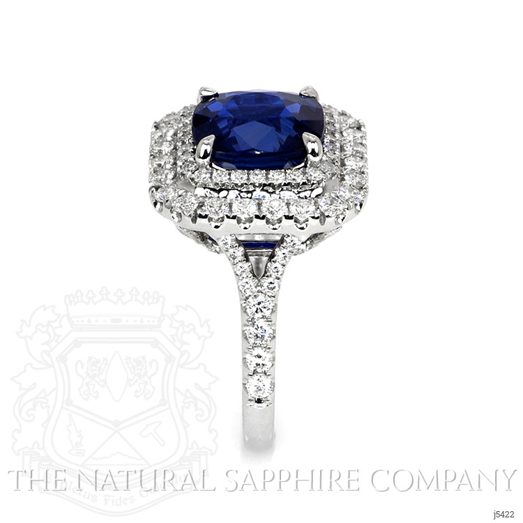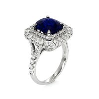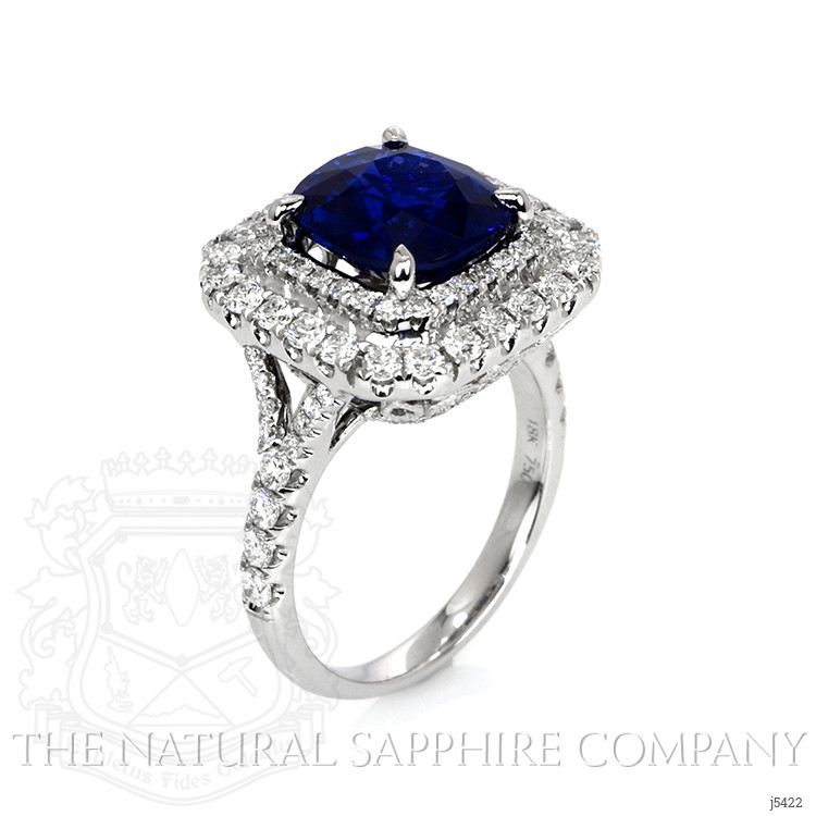 When you have an extraordinary sapphire and diamond ring like this, which features a 4.35 natural untreated cushion blue sapphire from Mozambique, you will want to rejoice and share it with everyone around you. Being near it quickens your step, lightens your load, and makes your day that much brighter. The designers of this one-of-a-kind ring have labored to enhance this sapphire to the peak of its glory. A breathtaking ninety-nine F color pave set round diamonds encircle the center stone in an incredible halo and accent the graceful split shank and under gallery. Its intricate 18K white gold design is captivating, flattering, and feminine. You will have to become accustomed to sharing because all your friends will flock to admire this spectacular new ring in your life.