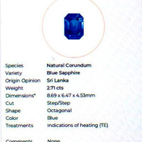 The ring primarily features a beautiful, transparent IGI certified Blue 2.71 carat emerald cut shape blue sapphire with the dimensions of 8.69 x 6.47 x 4.53 mm and is emerald cut. It has a clarity grade of eye clean (evaluated at eye level), intense color intensity, and an excellent polish. The origin of this sapphire is Ceylon (Sri Lanka). Also featured in the ring are 36 white round shaped mixed brilliant cut natural diamonds, weighing a total of 0.80 carats. The natural diamonds have a clarity grade of vs1 - Very Slightly Included., F color The ring is entirely set in 18K white gold.