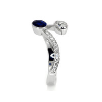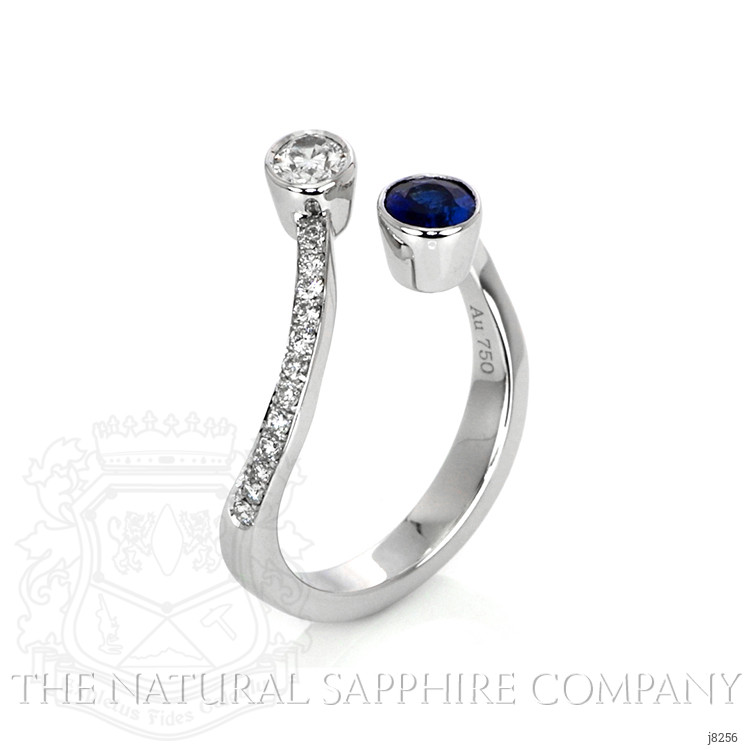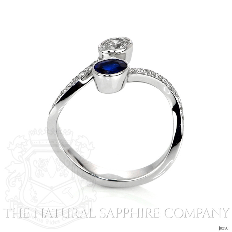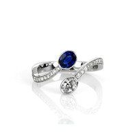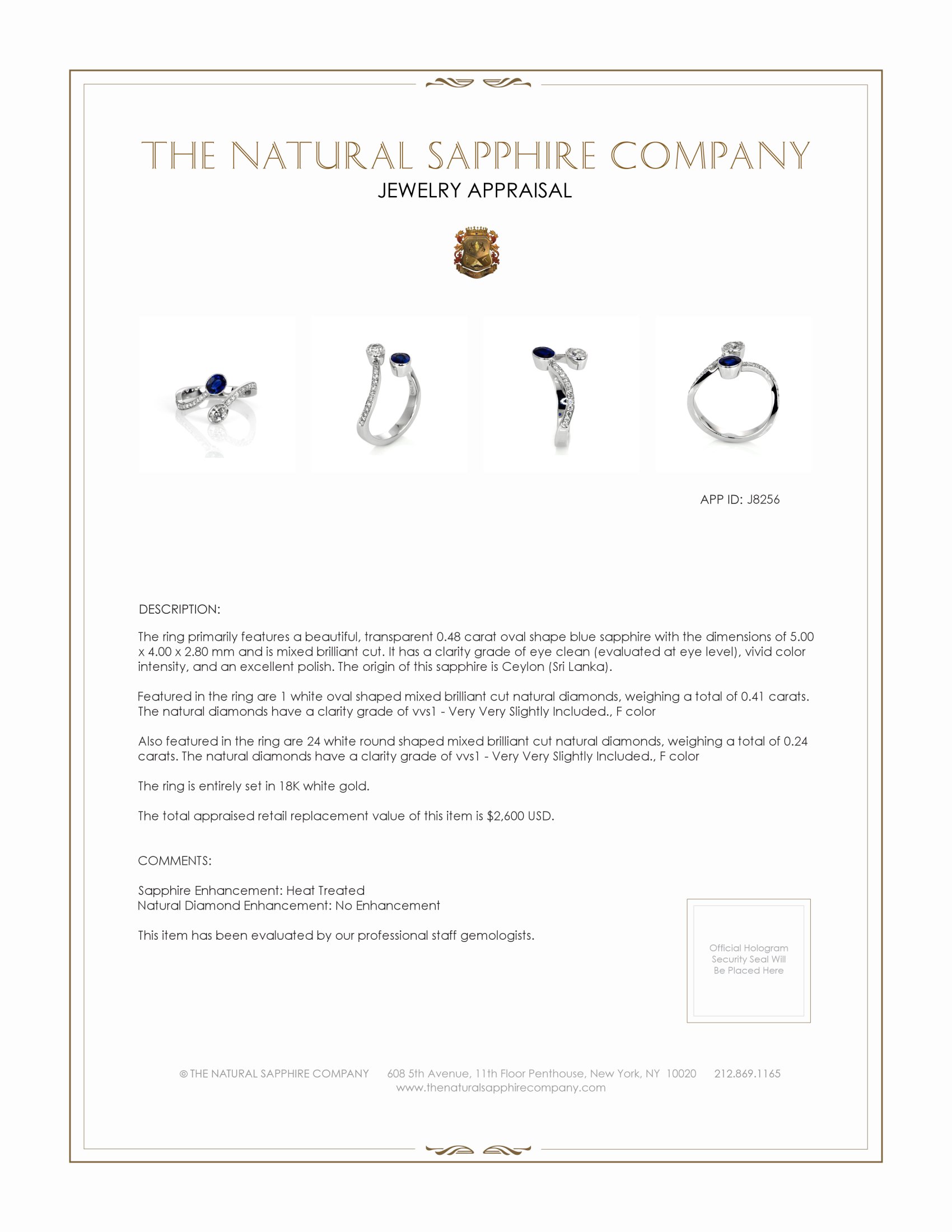 The ring primarily features a beautiful, transparent 0.48 carat oval shape blue sapphire with the dimensions of 5.00 x 4.00 x 2.80 mm and is mixed brilliant cut. It has a clarity grade of eye clean (evaluated at eye level), vivid color intensity, and an excellent polish. The origin of this sapphire is Ceylon (Sri Lanka). Featured in the ring are 1 white oval shaped mixed brilliant cut natural diamonds, weighing a total of 0.41 carats. The natural diamonds have a clarity grade of vvs1 - Very Very Slightly Included., F color Also featured in the ring are 24 white round shaped mixed brilliant cut natural diamonds, weighing a total of 0.24 carats. The natural diamonds have a clarity grade of vvs1 - Very Very Slightly Included., F color The ring is entirely set in 18K white gold.