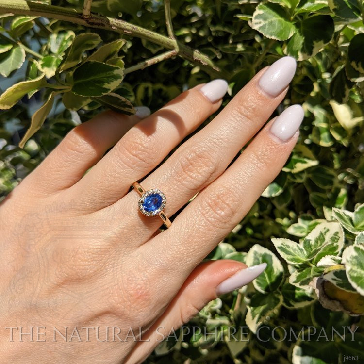 The ring primarily features a beautiful, transparent 1.00 carat oval shape blue sapphire with the dimensions of 6.65 x 5.30 x 3.29 mm and is mixed brilliant cut. It has a clarity grade of eye clean (evaluated at eye level), intense color intensity, and an excellent polish. The origin of this sapphire is Ceylon (Sri Lanka). Also featured in the ring are 16 white round shaped brilliant cut natural diamonds, weighing a total of 0.20 carats. The natural diamonds have a clarity grade of vs2 - Very Slightly Included., F color The ring is entirely set in 14K yellow gold.