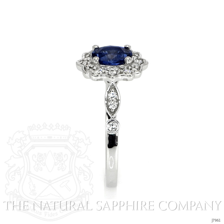 The ring primarily features a beautiful, transparent 1.06 carat oval shape blue sapphire with the dimensions of 6.65 x 5.12 x 3.81 mm and is mixed brilliant cut. It has a clarity grade of slightly included (evaluated at eye level), intense color intensity, and an excellent polish. The origin of this sapphire is Ceylon (Sri Lanka). Also featured in the ring are 26 white round shaped brilliant cut natural diamonds, weighing a total of 0.27 carats. The natural diamonds have a clarity grade of vs2 - Very Slightly Included., F color The ring is entirely set in 14K white gold.