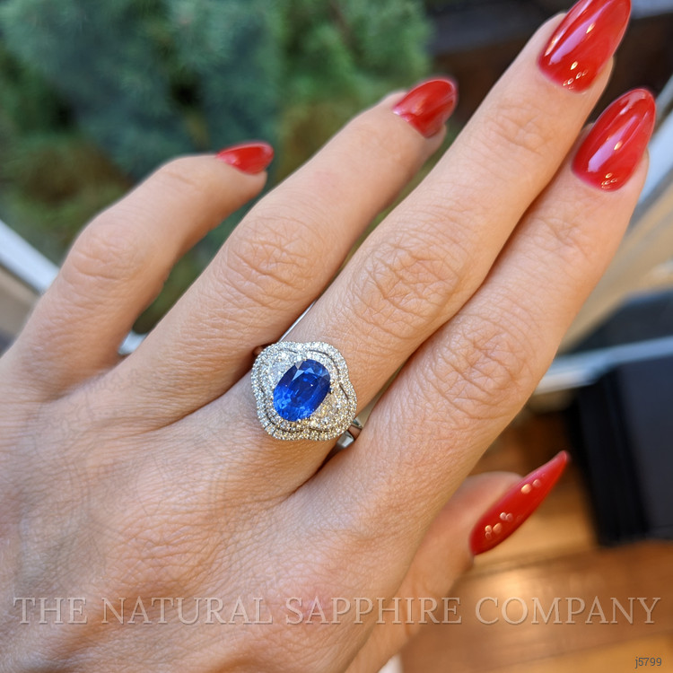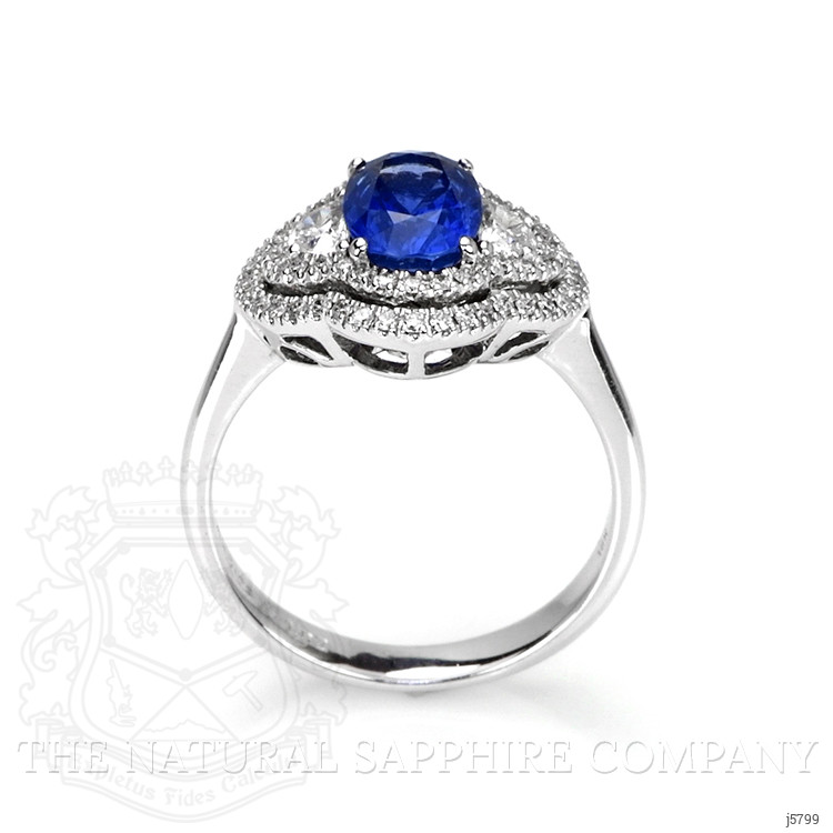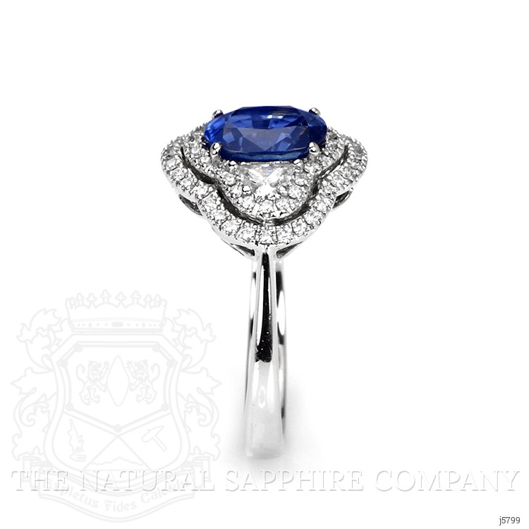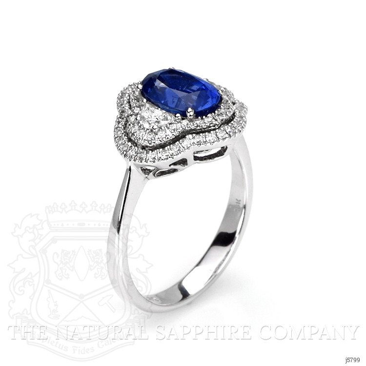The ring primarily features a beautiful, transparent 1.80 carat oval shape blue sapphire with the dimensions of 8.54 x 5.90 x 5.26 mm and is mixed brilliant cut. It has a clarity grade of very slightly included (evaluated at eye level), intense color intensity, and an excellent polish. The origin of this sapphire is Ceylon (Sri Lanka). Featured in the ring are 2 white half moon shaped mixed brilliant cut natural diamonds, weighing a total of 0.21 carats. The natural diamonds have a clarity grade of vs1 - Very Slightly Included., F color Also featured in the ring are 66 white round shaped brilliant cut natural diamonds, weighing a total of 0.24 carats. The natural diamonds have a clarity grade of vvs2 - Very Very Slightly Included., F color The ring is entirely set in 18K white gold.