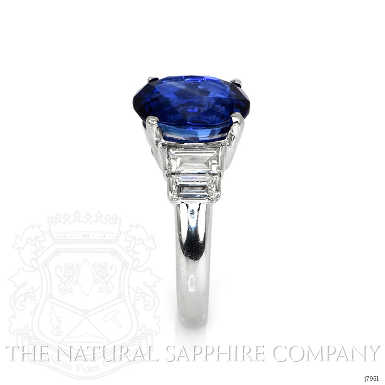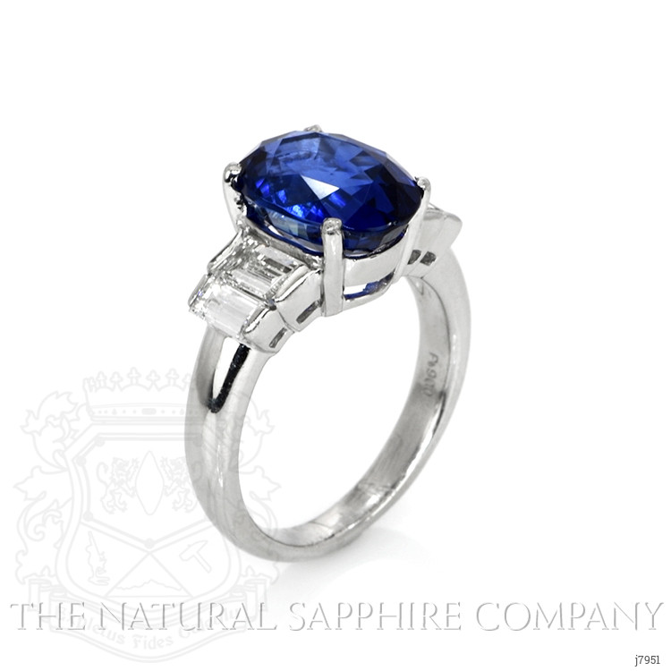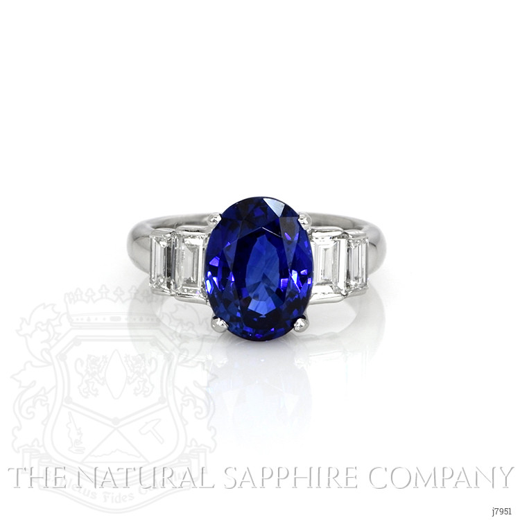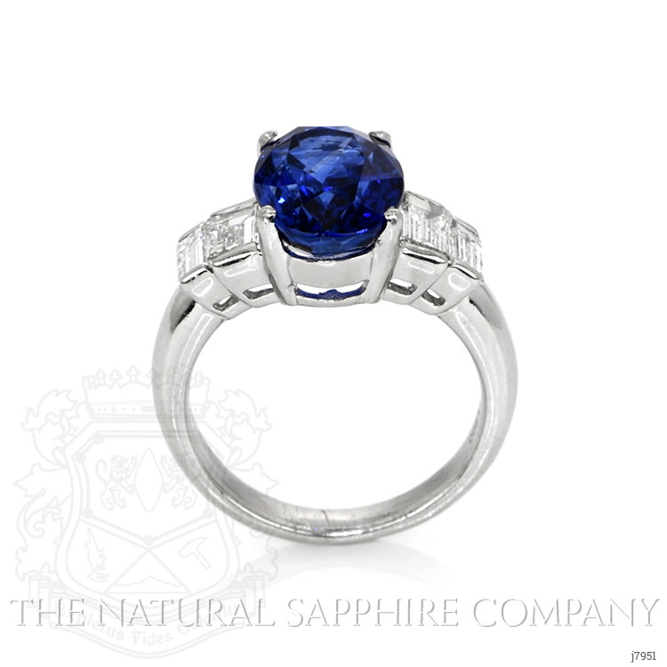 The ring primarily features a beautiful, transparent AGL certified 4.74 carat oval shape blue sapphire with the dimensions of 10.94 x 8.17 x 5.72 mm and is mixed brilliant cut. It has a clarity grade of eye clean (evaluated at eye level), vivid color intensity, and an excellent polish. The origin of this sapphire is Madagascar. Also featured in the ring are 4 white baguette (straight) shaped baguette cut natural diamonds, weighing a total of 1.20 carats. The natural diamonds have a clarity grade of vvs1 - Very Very Slightly Included., F color The ring is entirely set in platinum 950.