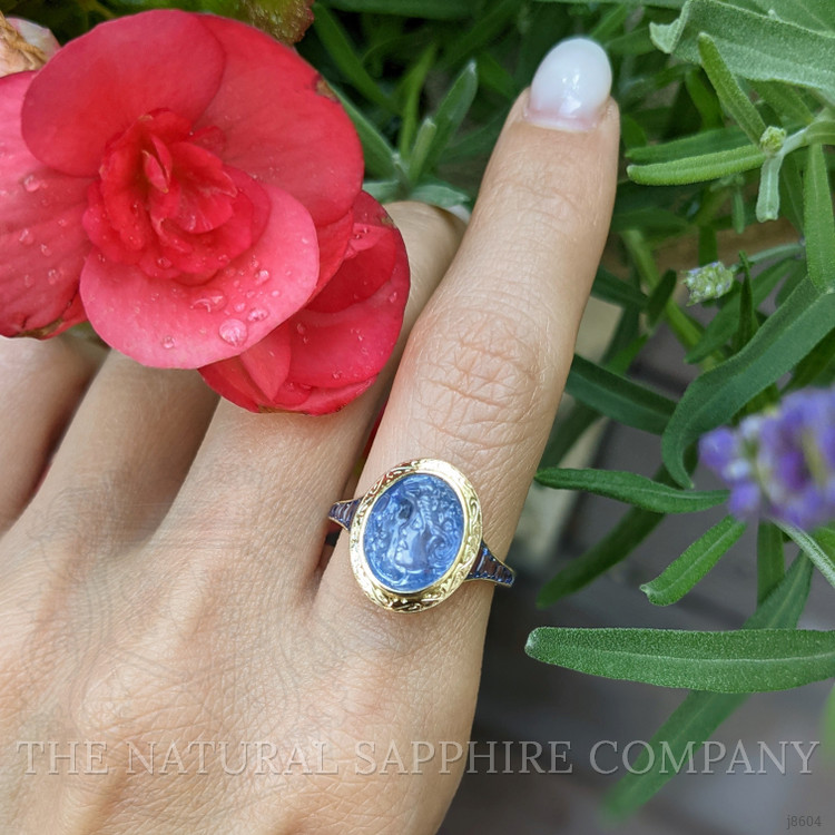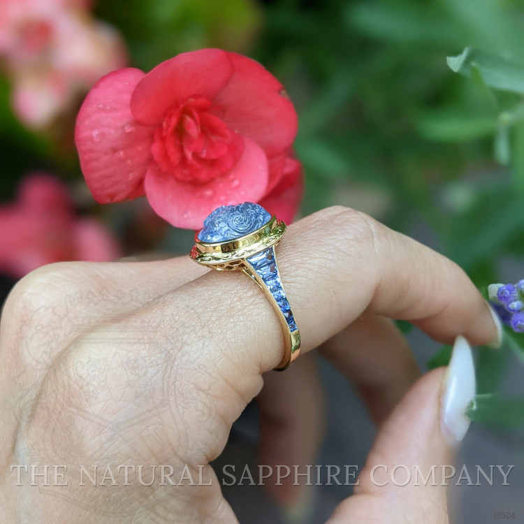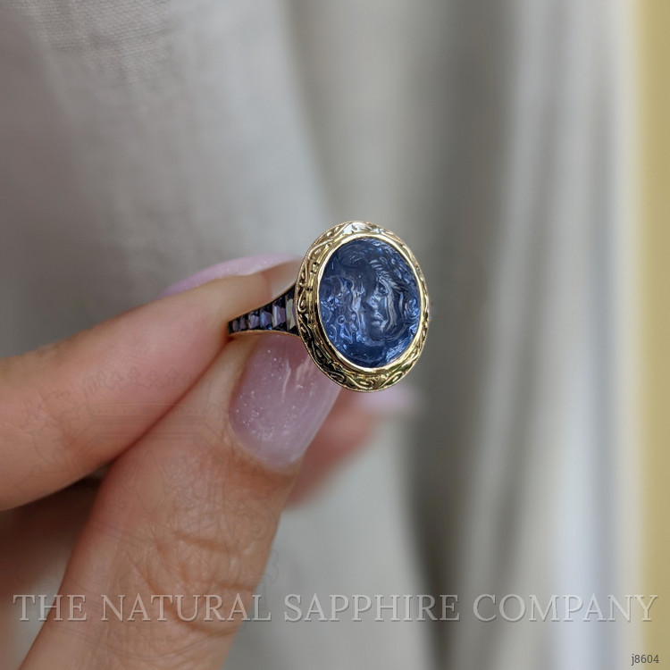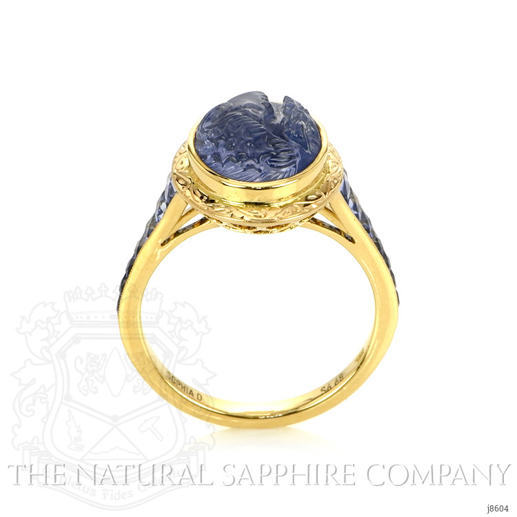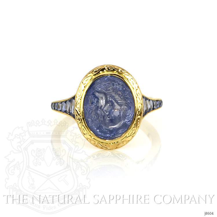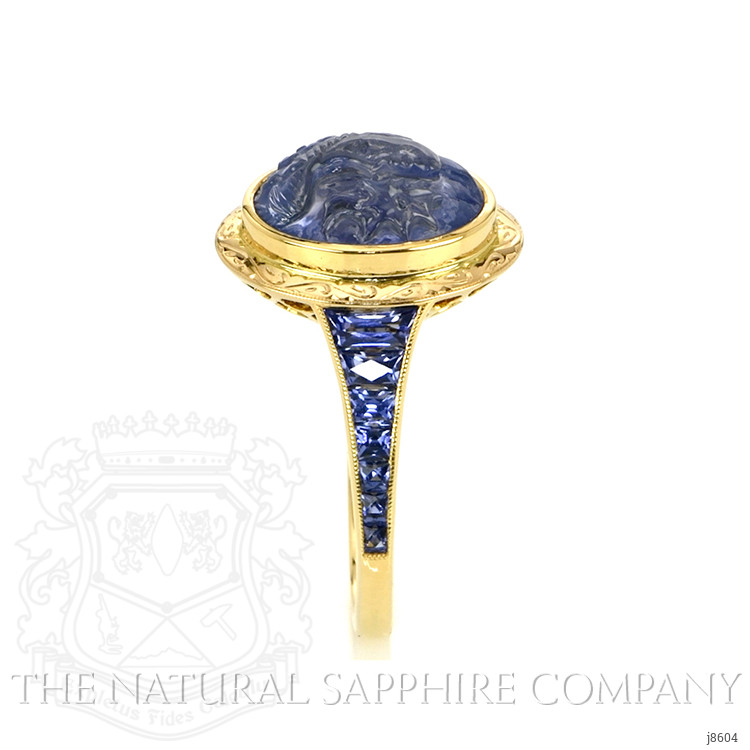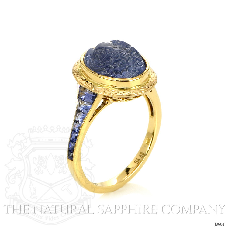 The ring primarily features a beautiful, transparent 6.68 carat oval shape blue sapphire with the dimensions of 11.26 x 8.95 x 7.32 mm and is carving cut. It has a clarity grade of very slightly included (evaluated at eye level), medium light color intensity, and an excellent polish. The origin of this sapphire is Ceylon (Sri Lanka). Also featured in the ring are 14 blue trapezoid shaped step cut sapphires, weighing a total of 0.80 carats. The sapphires have a clarity grade of eye clean, and color saturation of vivid. The ring is entirely set in 18K yellow gold.