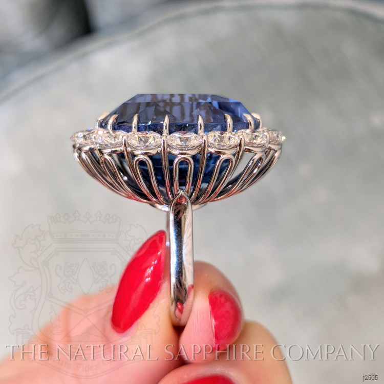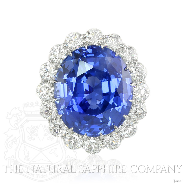 The Duchess of Cambridge’s engagement ring is arguably the most famous in the world, with its 12-carat oval-shaped blue Ceylon sapphire surrounded by a halo of diamonds, first given to Princess Diana of Wales. Naturally, its beauty and prominence have sparked a firestorm of replicas for the modern-day bride. Here, we offer you the largest of those reproductions worldwide, featuring one of the grandest gem-quality natural sapphires available for sale today. Totaling 69.35 carats, the sapphire, also of Sri Lankan origin, shows no indications of heat treatment for its spectacular color saturation and clarity as certified by the Gemological Institute of America. As such, it is an extremely rare find. Cut into an oval shape with a modified-brilliant-cut crown and step-cut pavilion to maximize its brilliance and sparkle, the stone is set into a handcrafted custom platinum mounting that resembles a crown.