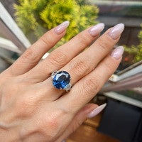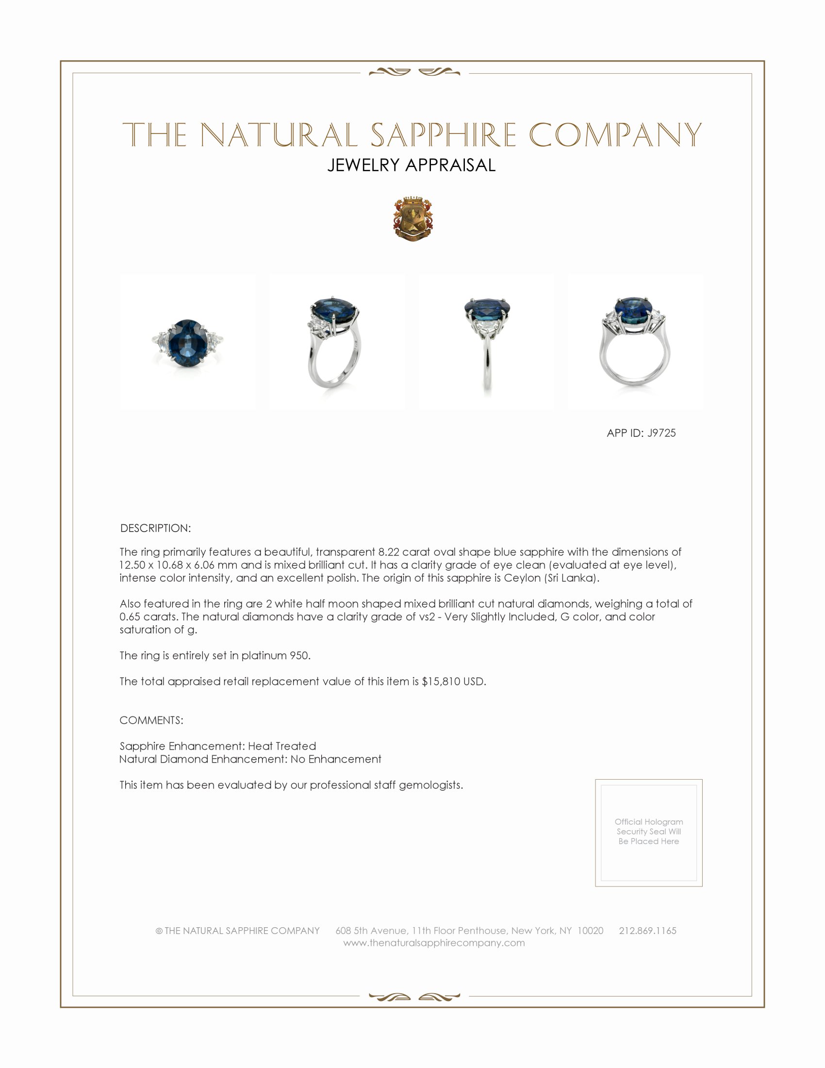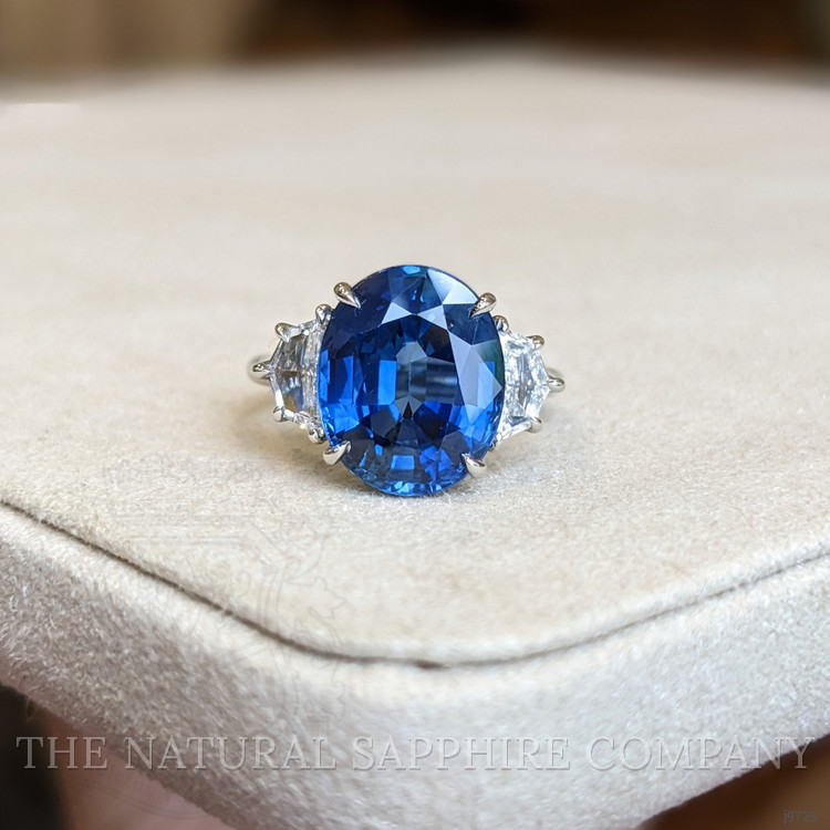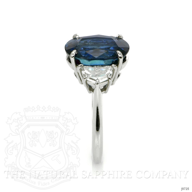 The ring primarily features a beautiful, transparent 8.22 carat oval shape blue sapphire with the dimensions of 12.50 x 10.68 x 6.06 mm and is mixed brilliant cut. It has a clarity grade of eye clean (evaluated at eye level), intense color intensity, and an excellent polish. The origin of this sapphire is Ceylon (Sri Lanka). Also featured in the ring are 2 white half moon shaped mixed brilliant cut natural diamonds, weighing a total of 0.65 carats. The natural diamonds have a clarity grade of vs2 - Very Slightly Included, G color, and color saturation of g. The ring is entirely set in platinum 950.