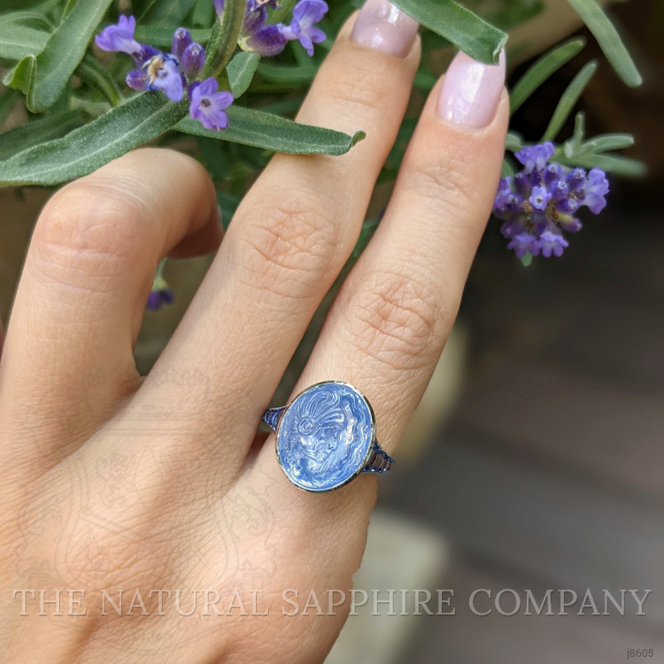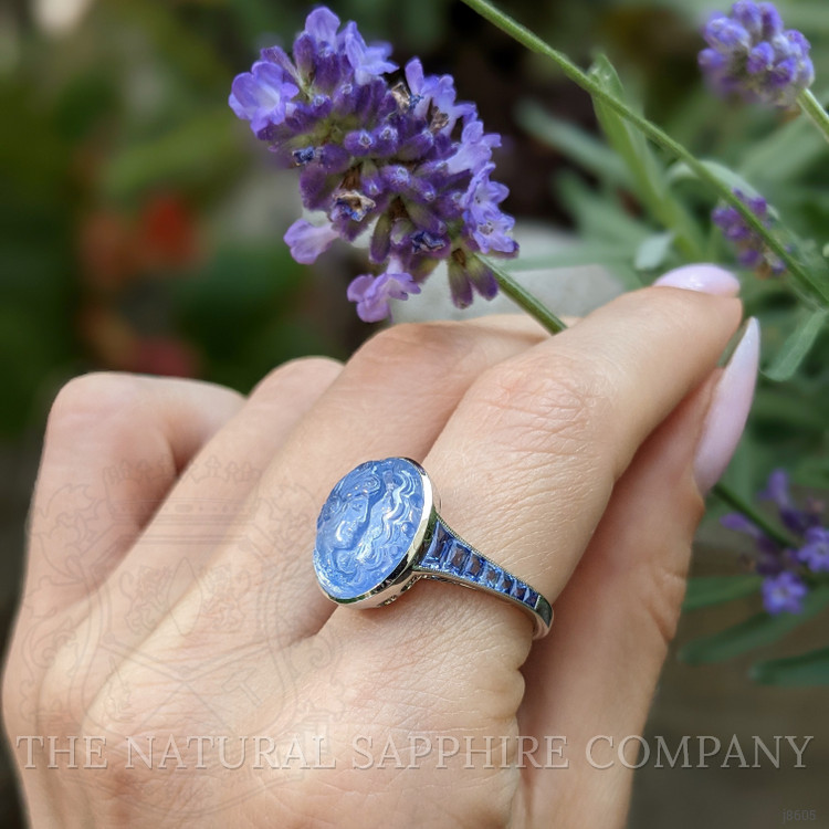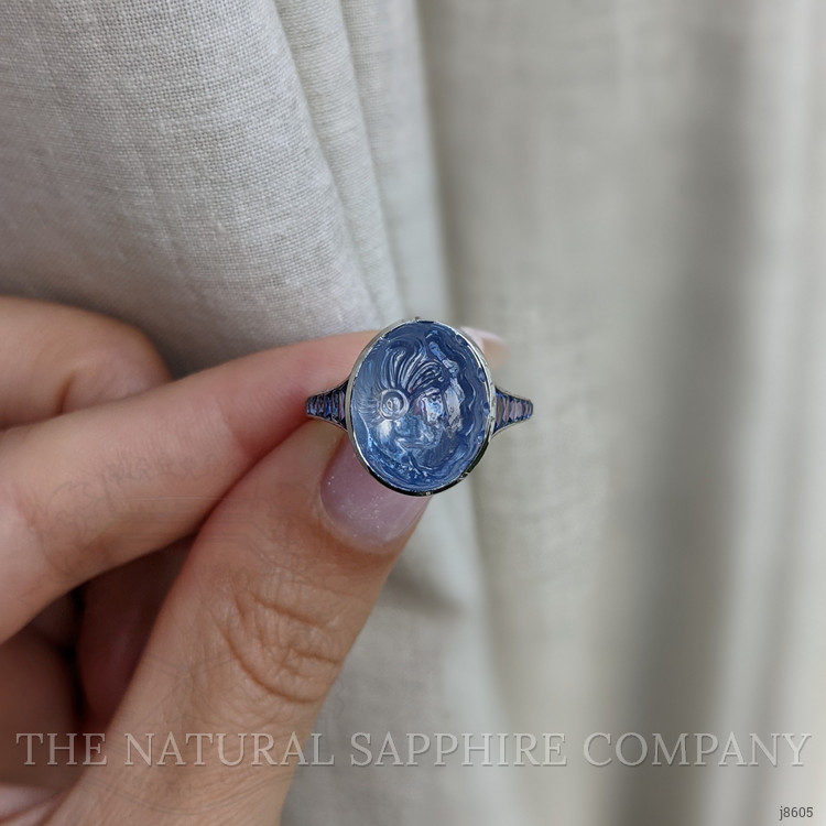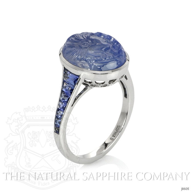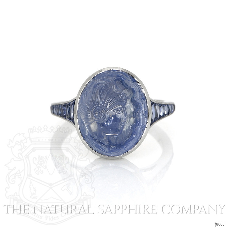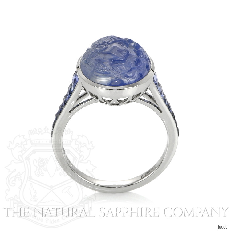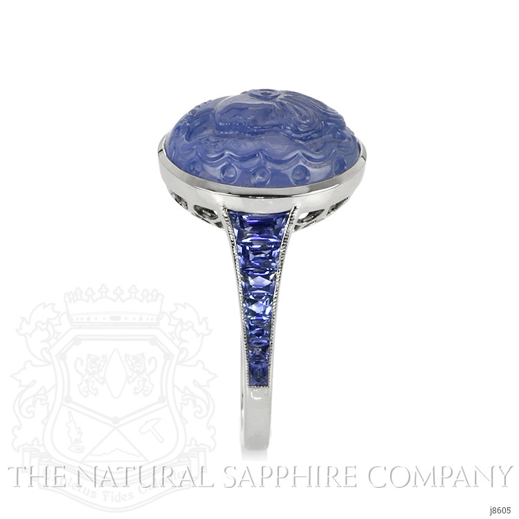 The ring primarily features a beautiful, transparent 9.62 carat oval shape blue sapphire with the dimensions of 13.74 x 11.24 x 6.59 mm and is carving cut. It has a clarity grade of eye clean (evaluated at eye level), medium light color intensity, and an excellent polish. The origin of this sapphire is Ceylon (Sri Lanka). Also featured in the ring are 14 blue trapezoid shaped step cut sapphires, weighing a total of 1.00 carats. The sapphires have a clarity grade of eye clean, and color saturation of vivid. The ring is entirely set in platinum 950.