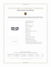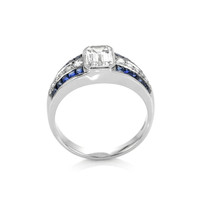 The ring primarily features with 24 blue princess shaped princess cut sapphires, weighing a total of 1.34 carats. The sapphires have a clarity grade of very slightly included, and color saturation of vivid. Featured in the ring are 1 white emerald cut shaped step cut natural diamonds, weighing a total of 1.18 carats. The natural diamonds have a clarity grade of vs1 - Very Slightly Included., F color Also featured in the ring are 12 white round shaped mixed brilliant cut natural diamonds, weighing a total of 0.18 carats. The natural diamonds have a clarity grade of vvs1 - Very Very Slightly Included., F color The ring is entirely set in platinum 950.