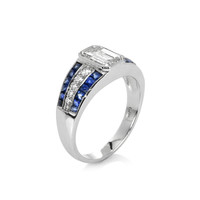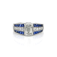 The ring primarily features with 24 blue princess shaped princess cut sapphires, weighing a total of 1.34 carats. The sapphires have a clarity grade of very slightly included, and color saturation of vivid. Featured in the ring are 1 white emerald cut shaped step cut natural diamonds, weighing a total of 1.18 carats. The natural diamonds have a clarity grade of vs1 - Very Slightly Included., F color Also featured in the ring are 12 white round shaped mixed brilliant cut natural diamonds, weighing a total of 0.18 carats. The natural diamonds have a clarity grade of vvs1 - Very Very Slightly Included., F color The ring is entirely set in platinum 950.