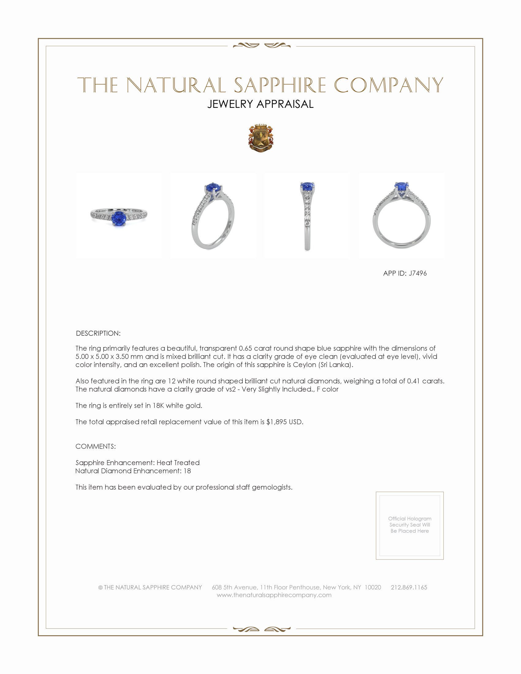 Complementing the central Sapphire are an array of 12 meticulously arranged white round shaped brilliant cut Natural Diamonds. These diamonds, with a total collective weight of 0.41 carats, exemplify precision cutting and careful selection, each stone demonstrating a clarity grade of vs2 - Very Slightly Included, ensuring that only minor inclusions are present, thus invisible without magnification. The diamonds possess an F color grade, signifying exceptional whiteness and an ability to reflect light beautifully. Their strategic placement around the Sapphire serves not only to accentuate its vivid coloration but also to amplify the overall luminosity and allure of the ring, creating a harmonious balance between the vivid center stone and its encircling diamonds.