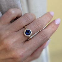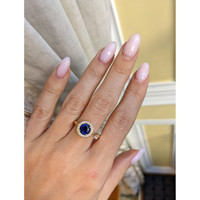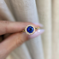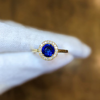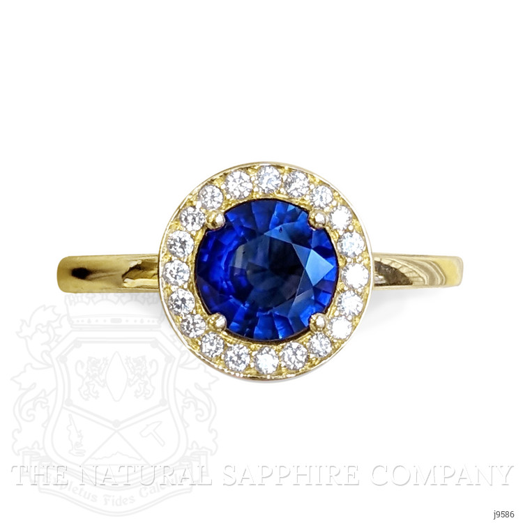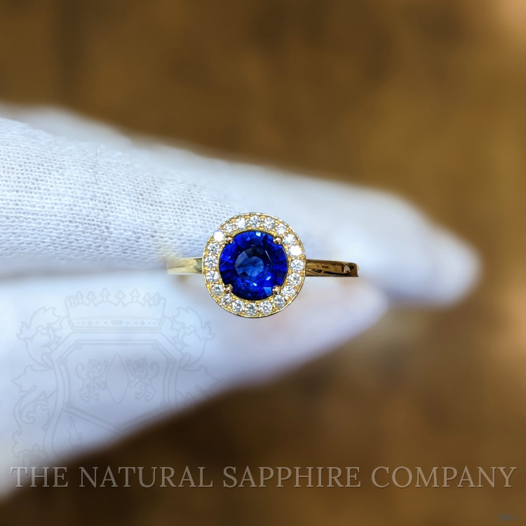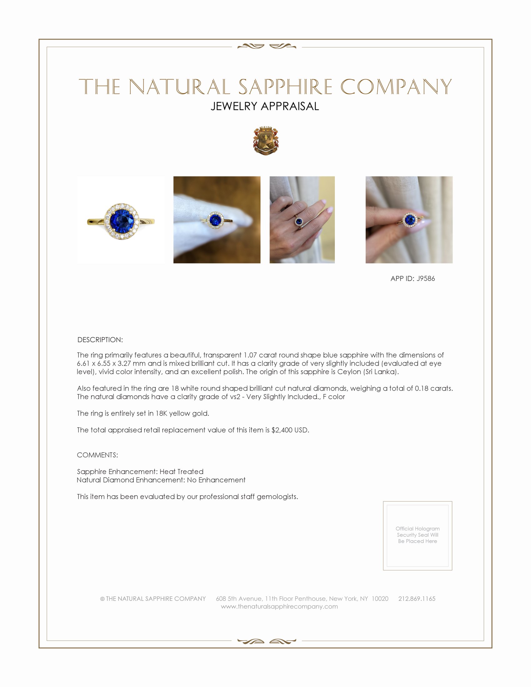 The ring primarily features a beautiful, transparent 1.07 carat round shape blue sapphire with the dimensions of 6.61 x 6.55 x 3.27 mm and is mixed brilliant cut. It has a clarity grade of very slightly included (evaluated at eye level), vivid color intensity, and an excellent polish. The origin of this sapphire is Ceylon (Sri Lanka). Also featured in the ring are 18 white round shaped brilliant cut natural diamonds, weighing a total of 0.18 carats. The natural diamonds have a clarity grade of vs2 - Very Slightly Included., F color The ring is entirely set in 18K yellow gold.