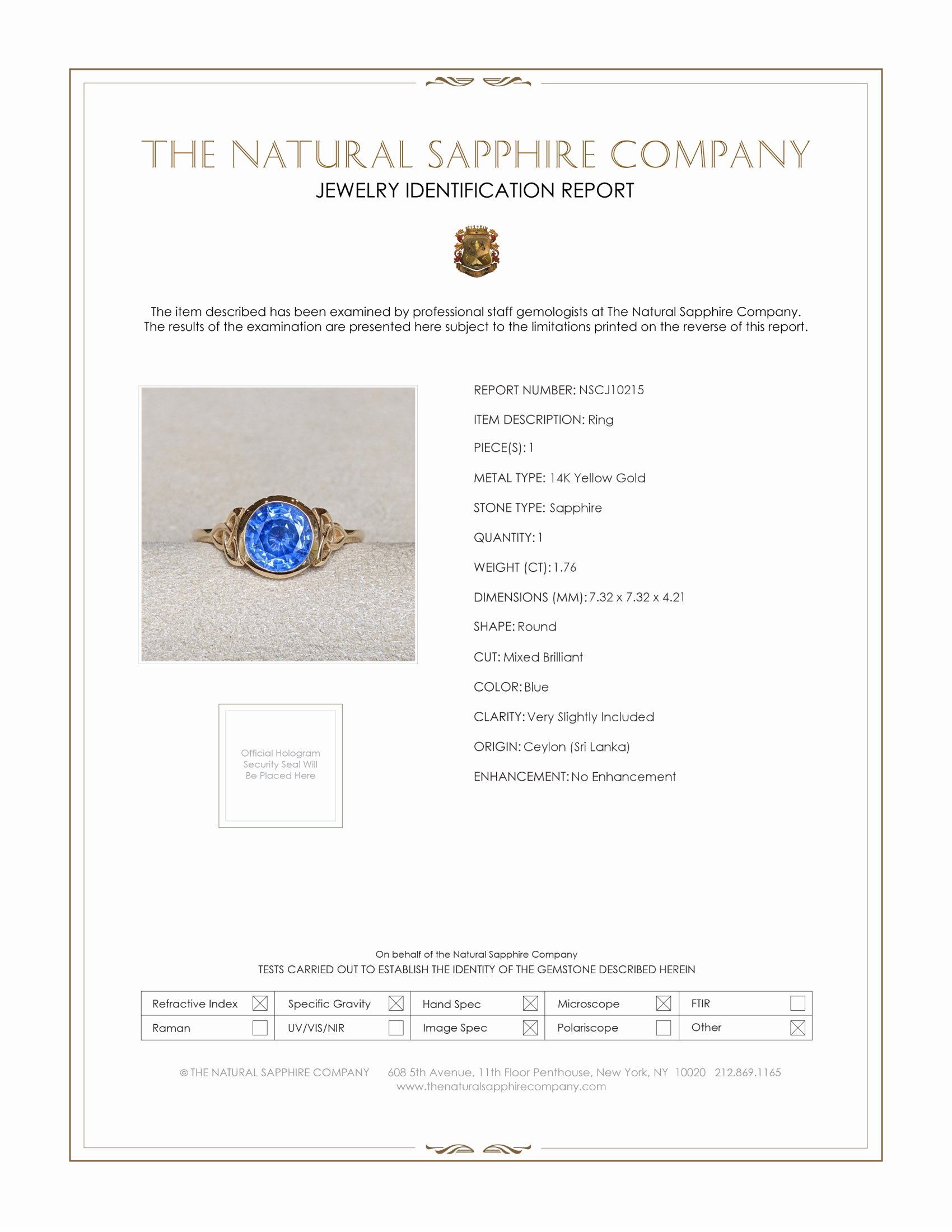 1.76 Ct. Blue Sapphire Bezel Ring, 14K Yellow Gold