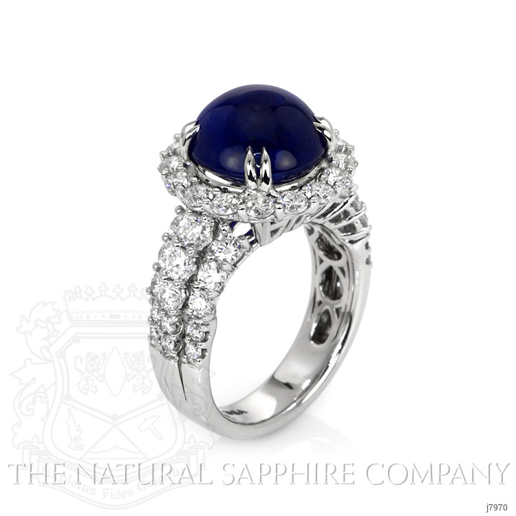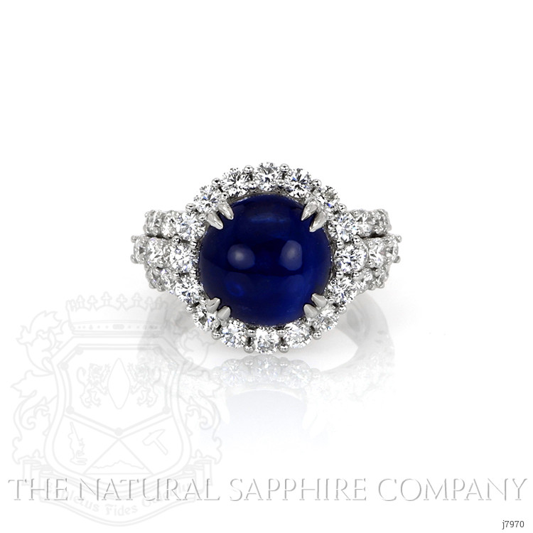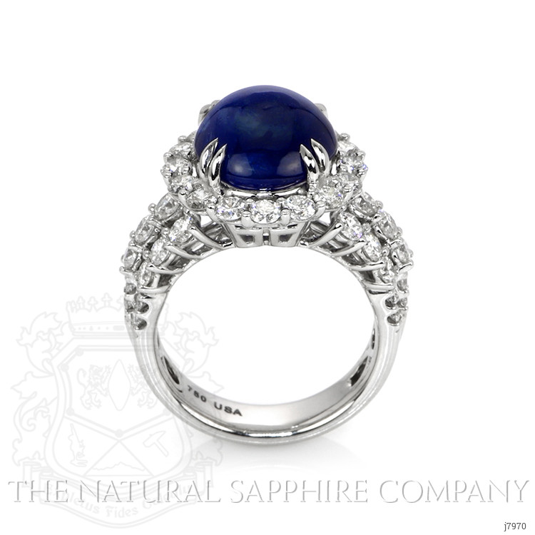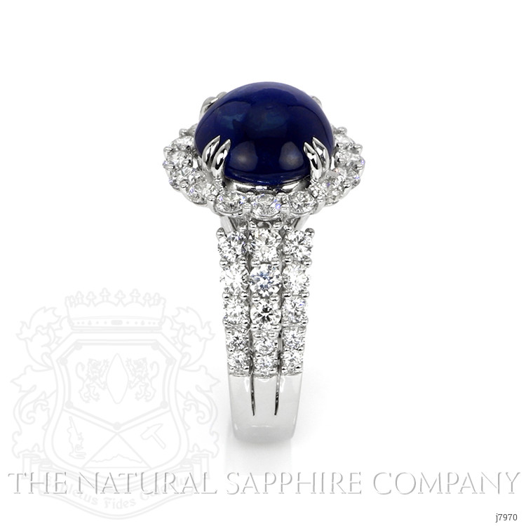 The ring primarily features a beautiful, translucent AGL certified 9.24 carat round shape blue sapphire with the dimensions of 11.42 x 11.27 x 7.43 mm and is double cabochon cut. It has a clarity grade of very slightly included (evaluated at eye level), vivid color intensity, and an excellent polish. The origin of this sapphire is Ceylon (Sri Lanka). Also featured in the ring are 46 white round shaped mixed brilliant cut natural diamonds, weighing a total of 2.40 carats. The natural diamonds have a clarity grade of vvs1 - Very Very Slightly Included., F color The ring is entirely set in 18K white gold.