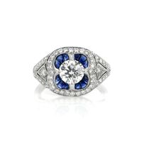 The ring primarily features with 12 blue various shaped mixed brilliant cut sapphires, weighing a total of 1.43 carats. The sapphires have a clarity grade of eye clean, and color saturation of vivid. Featured in the ring are 1 white round shaped mixed brilliant cut natural diamonds, weighing a total of 1.02 carats. The natural diamonds have a clarity grade of vs1 - Very Slightly Included., F color Also featured in the ring are 54 white round shaped mixed brilliant cut natural diamonds, weighing a total of 1.11 carats. The natural diamonds have a clarity grade of vvs1 - Very Very Slightly Included., F color The ring is entirely set in platinum 950.