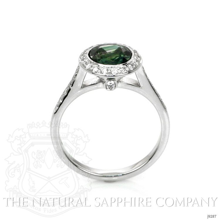 The ring primarily features a beautiful, transparent 1.27 carat round shape bluish green sapphire with the dimensions of 6.50 x 6.44 x 3.57 mm and is mixed brilliant cut. It has a clarity grade of very slightly included (evaluated at eye level), dark color intensity, and an excellent polish. The origin of this sapphire is Nigeria. Also featured in the ring are 44 white round shaped brilliant cut natural diamonds, weighing a total of 0.29 carats. The natural diamonds have a clarity grade of vs2 - Very Slightly Included., F color The ring is entirely set in 18K white gold.