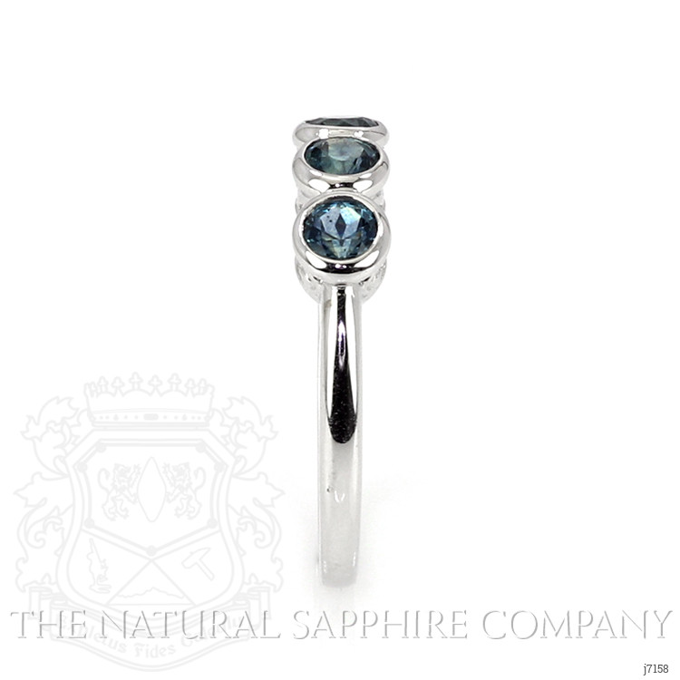 The ring primarily features with 3 bluish grey round shaped mixed brilliant cut sapphires, weighing a total of 0.72 carats. The sapphires have a clarity grade of very slightly included, and color saturation of medium intense. The ring is entirely set in 14K white gold.