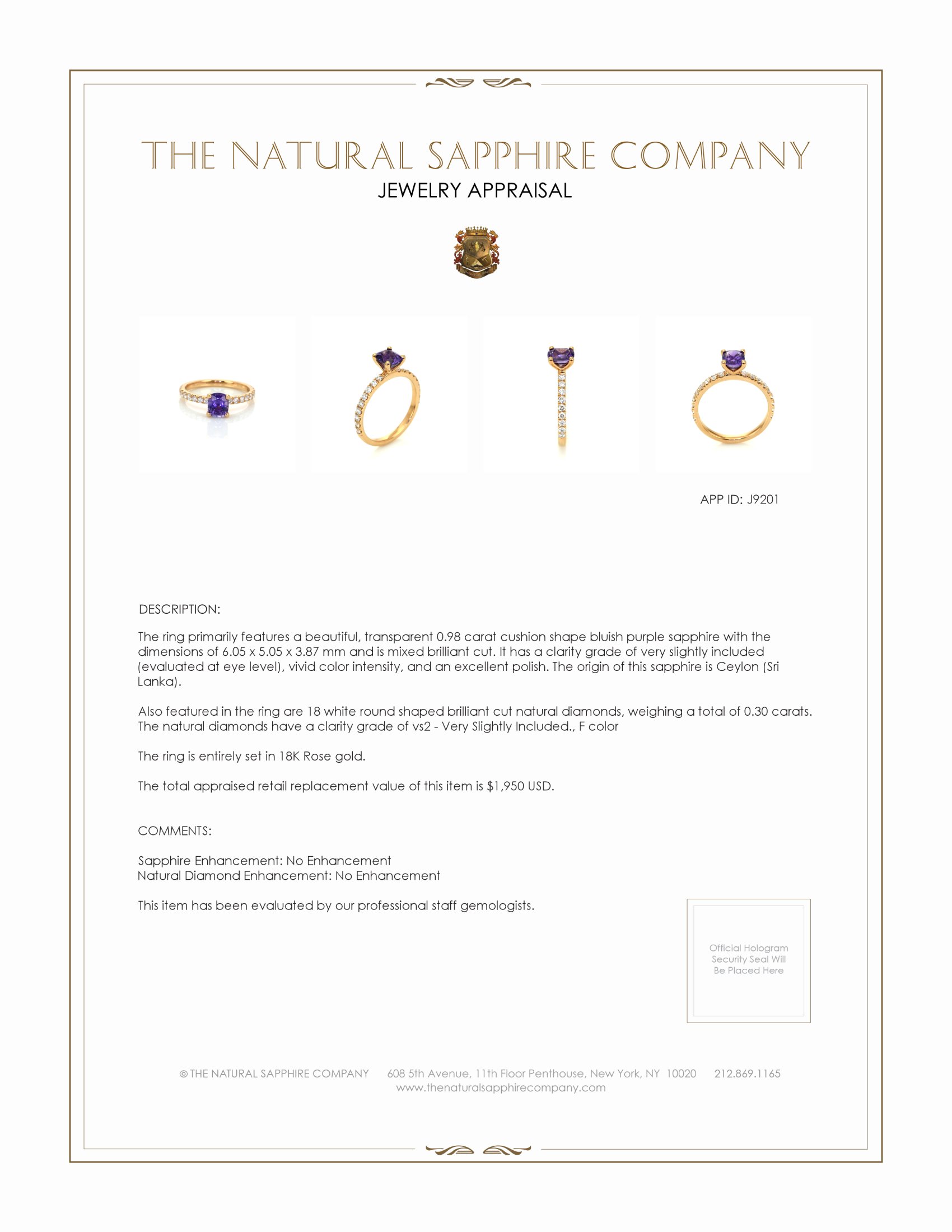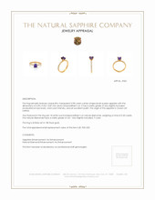The ring primarily features a beautiful, transparent 0.98 carat cushion shape bluish purple sapphire with the dimensions of 6.05 x 5.05 x 3.87 mm and is mixed brilliant cut. It has a clarity grade of very slightly included (evaluated at eye level), vivid color intensity, and an excellent polish. The origin of this sapphire is Ceylon (Sri Lanka). Also featured in the ring are 18 white round shaped brilliant cut natural diamonds, weighing a total of 0.30 carats. The natural diamonds have a clarity grade of vs2 - Very Slightly Included., F color The ring is entirely set in 18K Rose gold.