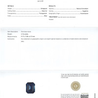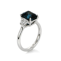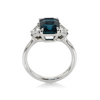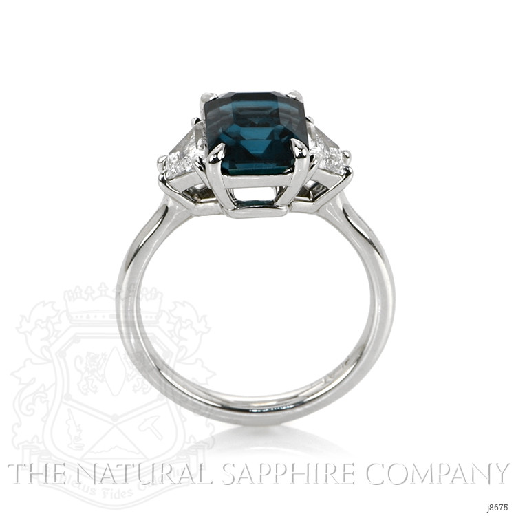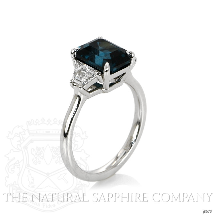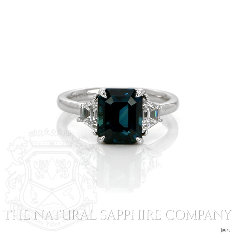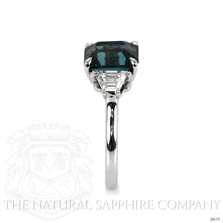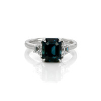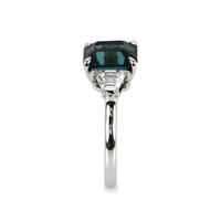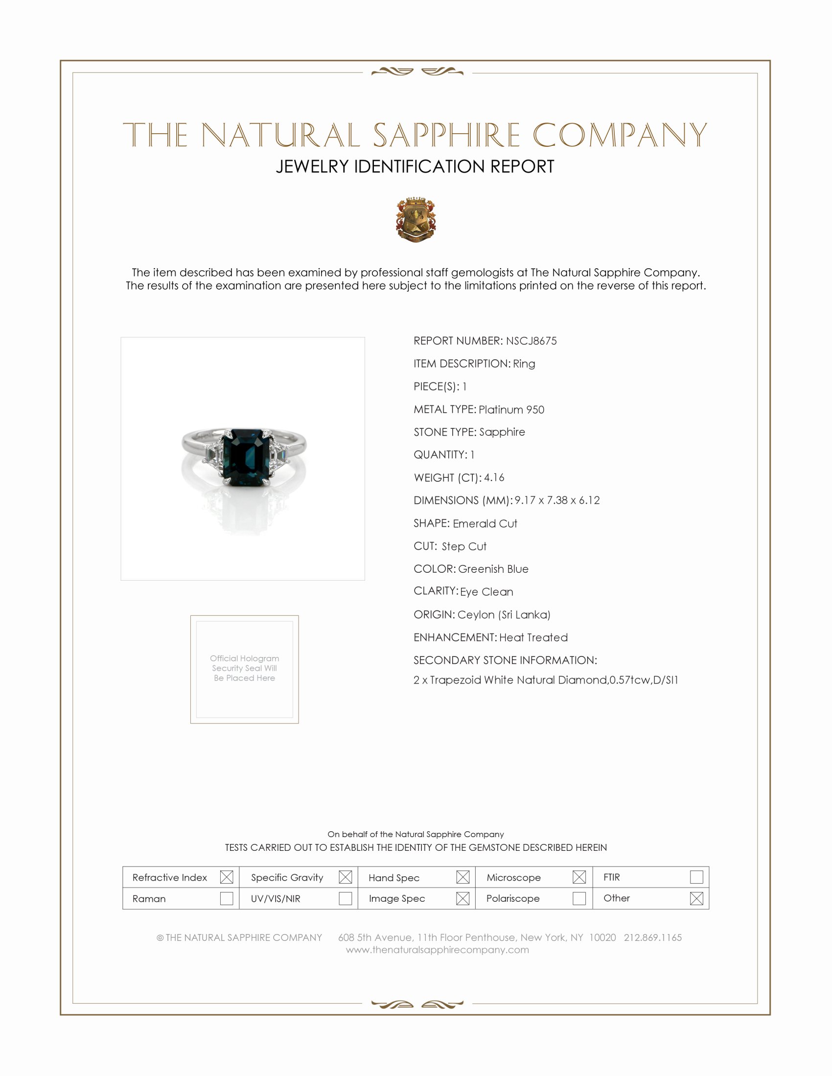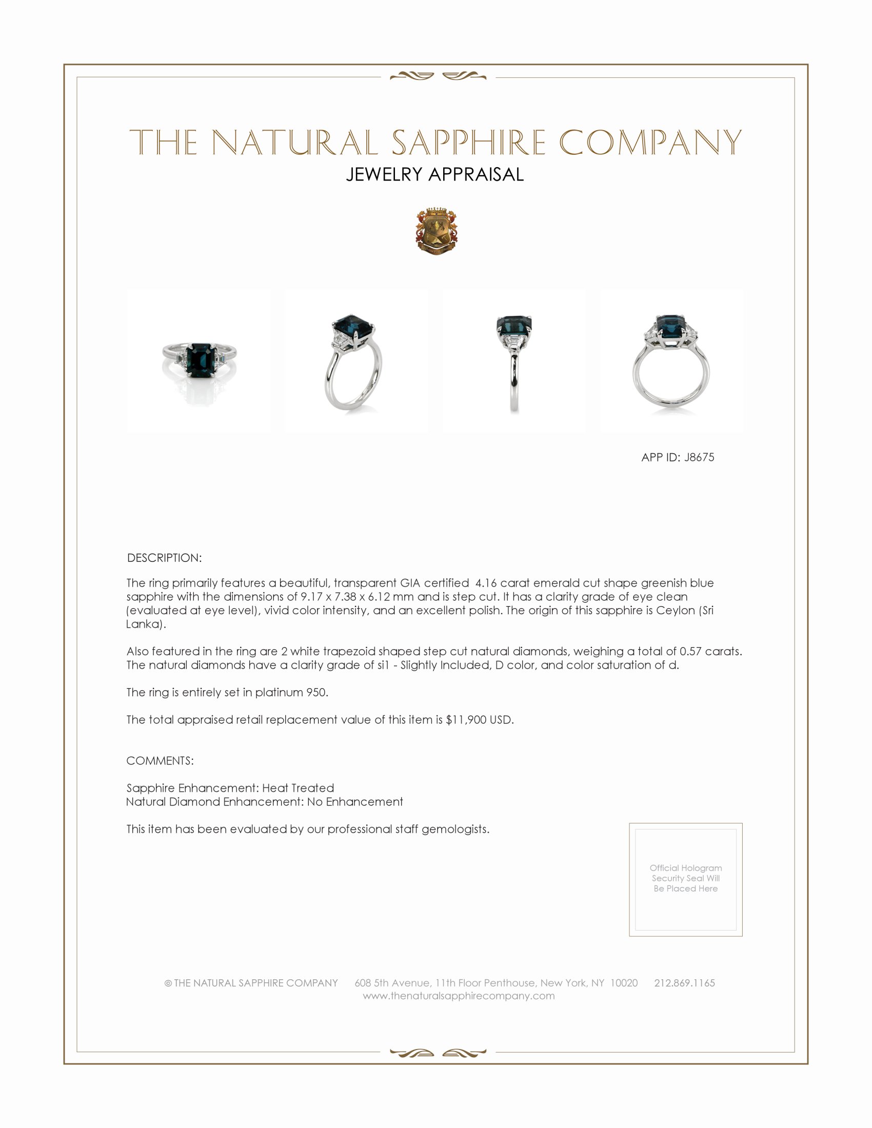 The ring primarily features a beautiful, transparent GIA certified 4.16 carat emerald cut shape greenish blue sapphire with the dimensions of 9.17 x 7.38 x 6.12 mm and is step cut. It has a clarity grade of eye clean (evaluated at eye level), vivid color intensity, and an excellent polish. The origin of this sapphire is Ceylon (Sri Lanka). Also featured in the ring are 2 white trapezoid shaped step cut natural diamonds, weighing a total of 0.57 carats. The natural diamonds have a clarity grade of si1 - Slightly Included, D color, and color saturation of d. The ring is entirely set in platinum 950.
