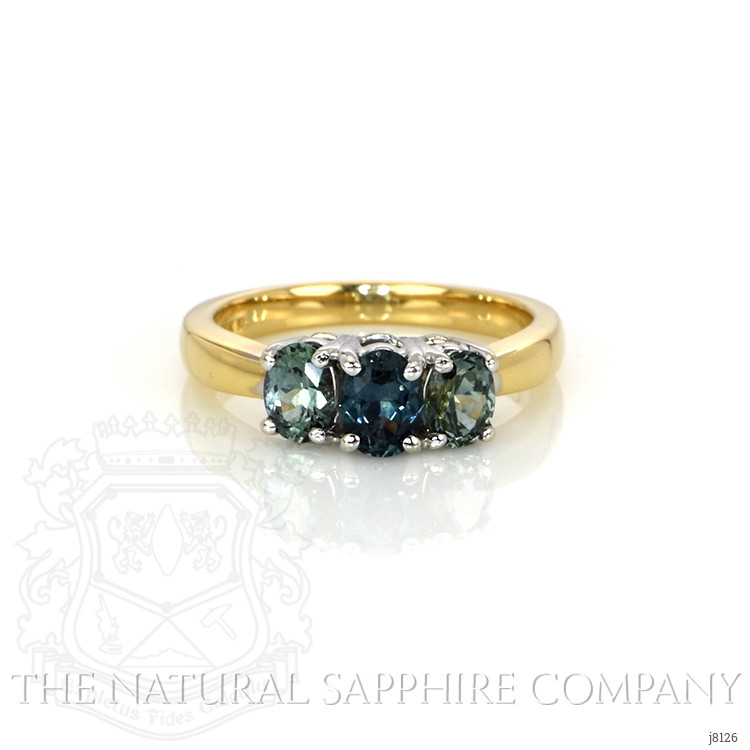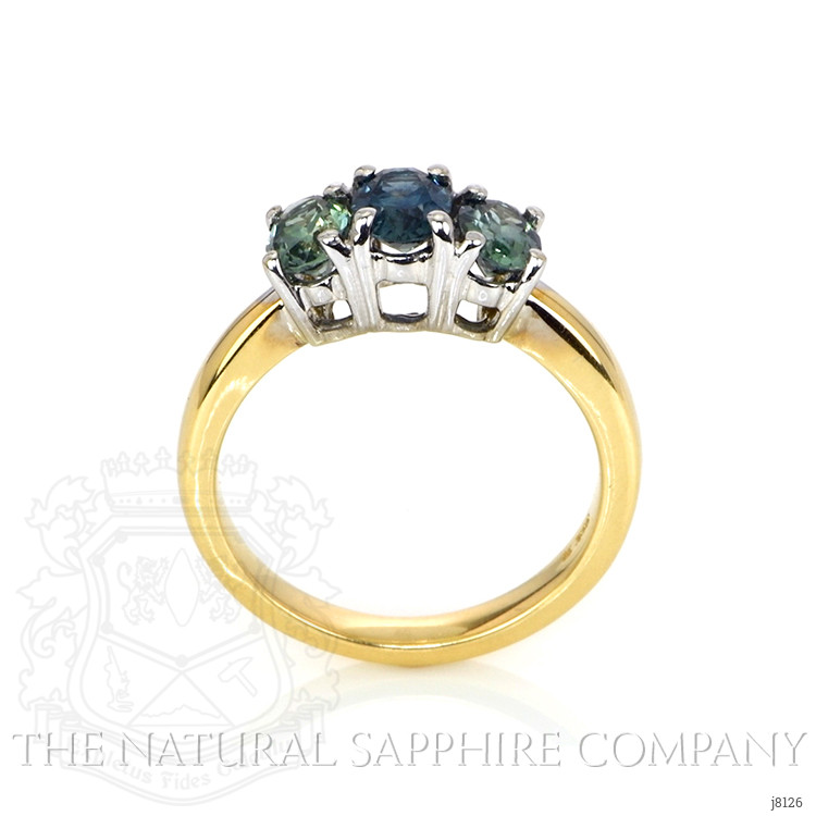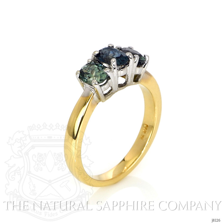 The ring primarily features a beautiful, transparent 0.63 carat oval shape greenish blue sapphire with the dimensions of 5.86 x 4.49 x 4.00 mm and is mixed brilliant cut. It has a clarity grade of eye clean (evaluated at eye level), vivid color intensity, and an excellent polish. The origin of this sapphire is Montana. Also featured in the ring are 2 green oval shaped mixed brilliant cut sapphires, weighing a total of 1.02 carats. The sapphires have a clarity grade of eye clean, and color saturation of intense. The ring is entirely set in 14K yellow gold.