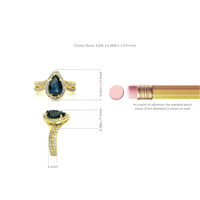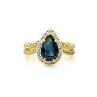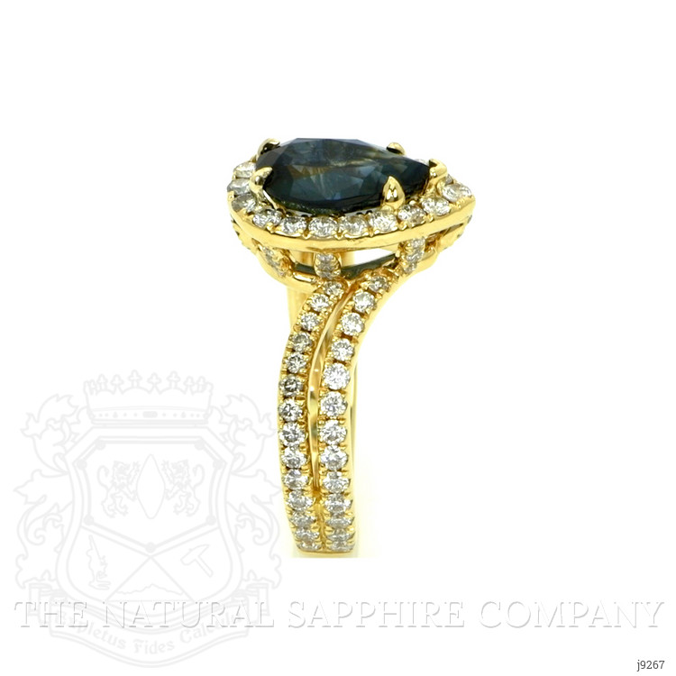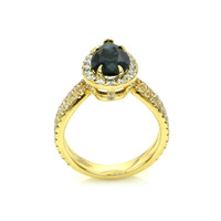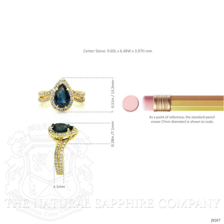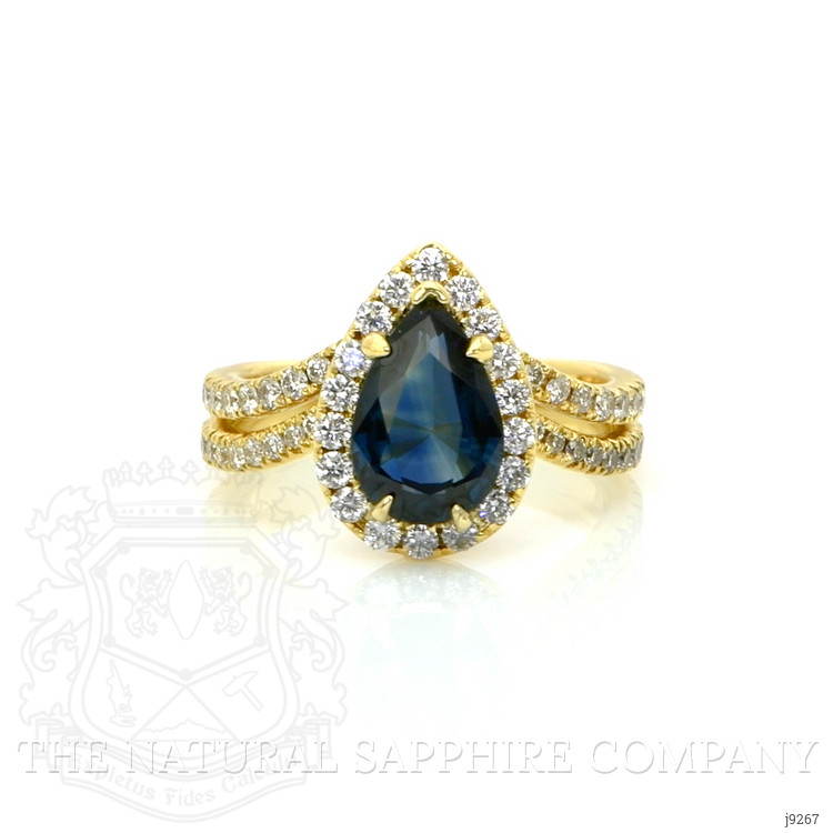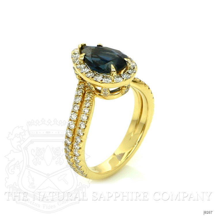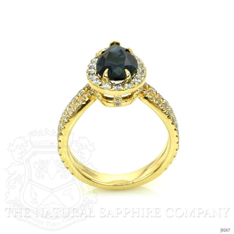 The ring primarily features a beautiful, transparent 2.04 carat pear shape greenish blue sapphire with the dimensions of 9.60 x 6.48 x 3.97 mm and is mixed brilliant cut. It has a clarity grade of very slightly included (evaluated at eye level), dark color intensity, and an excellent polish. The origin of this sapphire is Nigeria. Also featured in the ring are 96 white round shaped brilliant cut natural diamonds, weighing a total of 0.89 carats. The natural diamonds have a clarity grade of vs2 - Very Slightly Included., F color The ring is entirely set in 18K yellow gold.