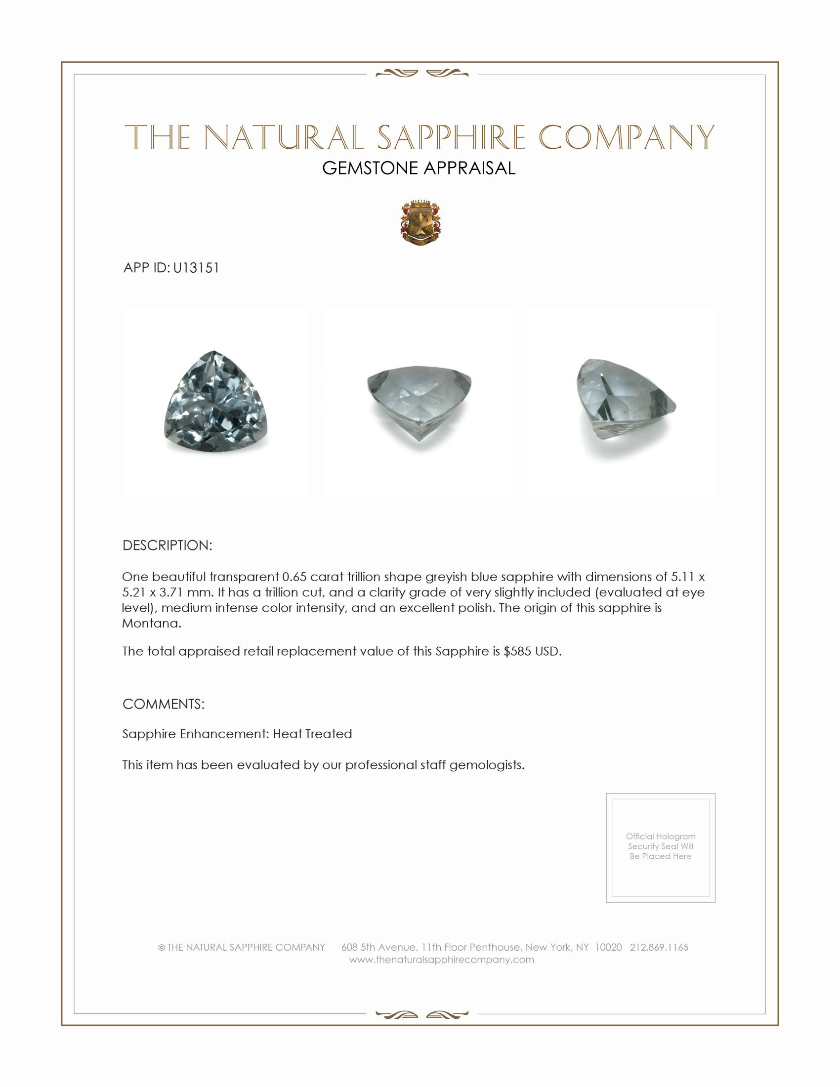 In the realm of luxury gemstones, few can rival the breathtaking allure of The Natural Sapphire Company's exquisite trillion-shaped greyish blue sapphire. With a weight of 0.65 carats and dimensions of 5.11 x 5.21 x 3.71 mm, this splendid gem is an ode to enrapturing elegance and a testament to the earth's natural majesty. Possessing an arresting trillion cut, it is a masterpiece of artisanal craftsmanship and a celebration of beauty in its purest form. Its radiant clarity, graded as very slightly included at eye level, unfurls a captivating internal landscape that aficionados of precious stones will recognize as the hallmark of genuine quality.