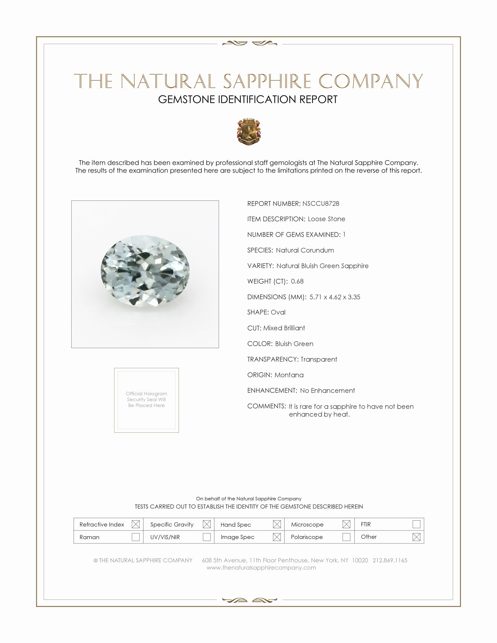 This sapphire boasts a medium light color intensity, rendering it an exceptionally versatile choice for a range of personal styles. Its color radiates a serene bluish-green hue, reminiscent of Montana's pristine landscapes from which it originates. The stone's eye-clean clarity ensures a flawless appearance to the naked eye, providing a captivating luminance that evokes both rarity and refinement. The gem has undergone an excellent polish, ensuring a smooth surface that enhances its ability to reflect light artfully. Such precision is indicative of the superior craftsmanship executed by The Natural Sapphire Company, whose attention to detail ensures that each gemstone is a piece of art in its own right.