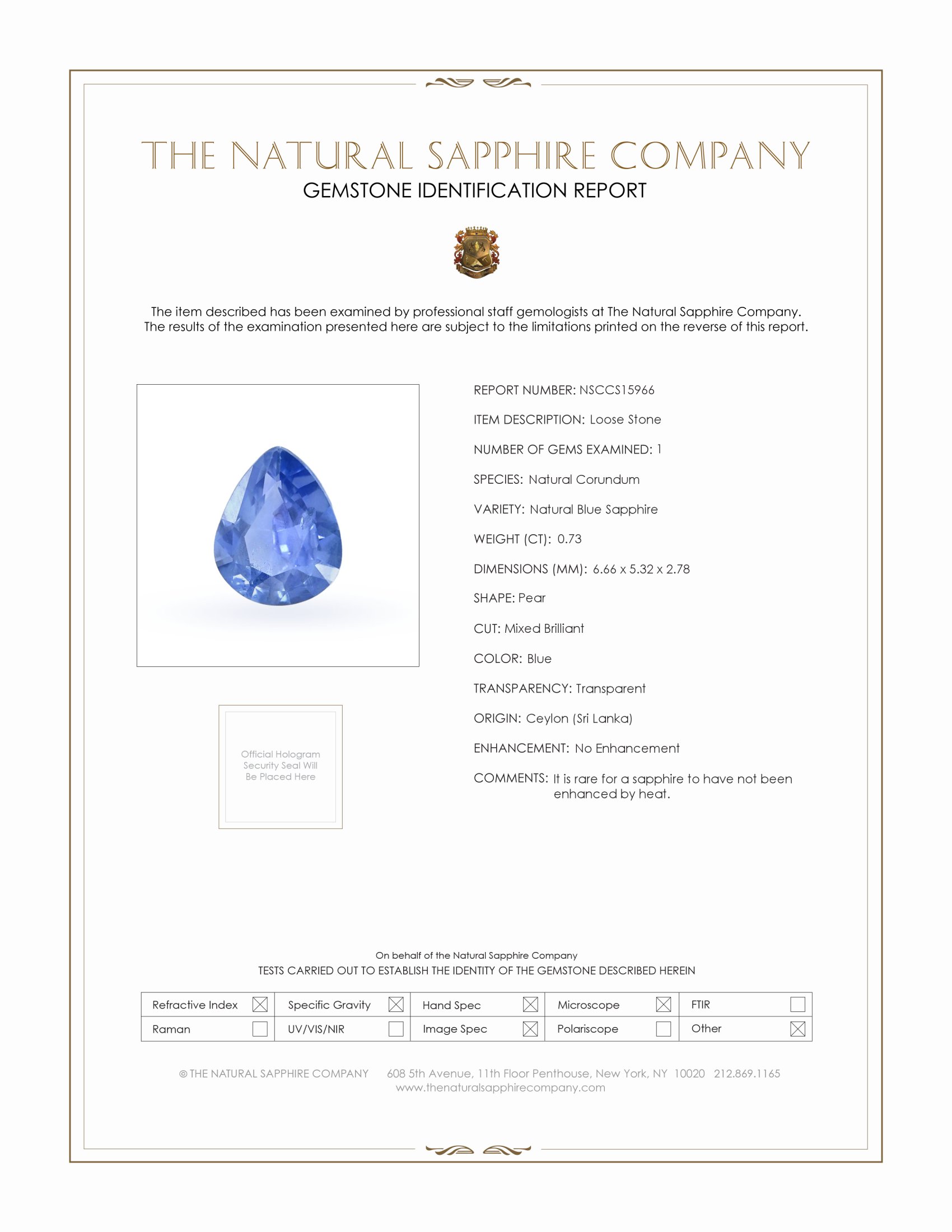 Discover a world where elegance meets unparalleled aesthetic with our exquisite 0.73 carat pear shape blue sapphire. At The Natural Sapphire Company, we understand that every discerning collector or individual in search of life's perfect adornment seeks more than just a gemstone. You seek an emblem of personal power and distinction. This stunning sapphire, with its captivating hues and pristine clarity, promises to fulfill that desire in the most remarkable way.