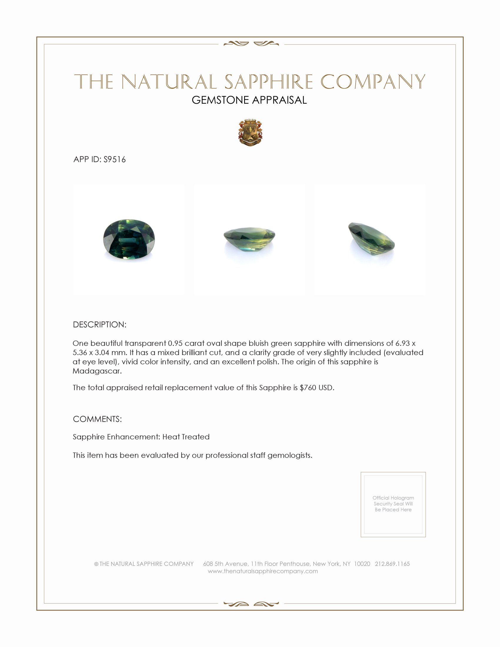Envisage the aura of royalty this beautiful transparent gem radiates, with its 0.95 carats serving as an epitome of refined elegance. Its vivid bluish green hue, reminiscent of the delicate amalgam of oceanic grace and lush verdant landscapes, calls to soul-stirring adventures and the serenity of boundless horizons. The mixed brilliant cut of the sapphire captivates light with a playful spirit transforming ordinary moments into lifelong memories creating an emotional bond unparalleled by less extraordinary stones. It is this dance of colors enhanced by the gemstone's excellent polish that extends beyond visual delight to embrace the heart evoking feelings of joy and fulfillment.