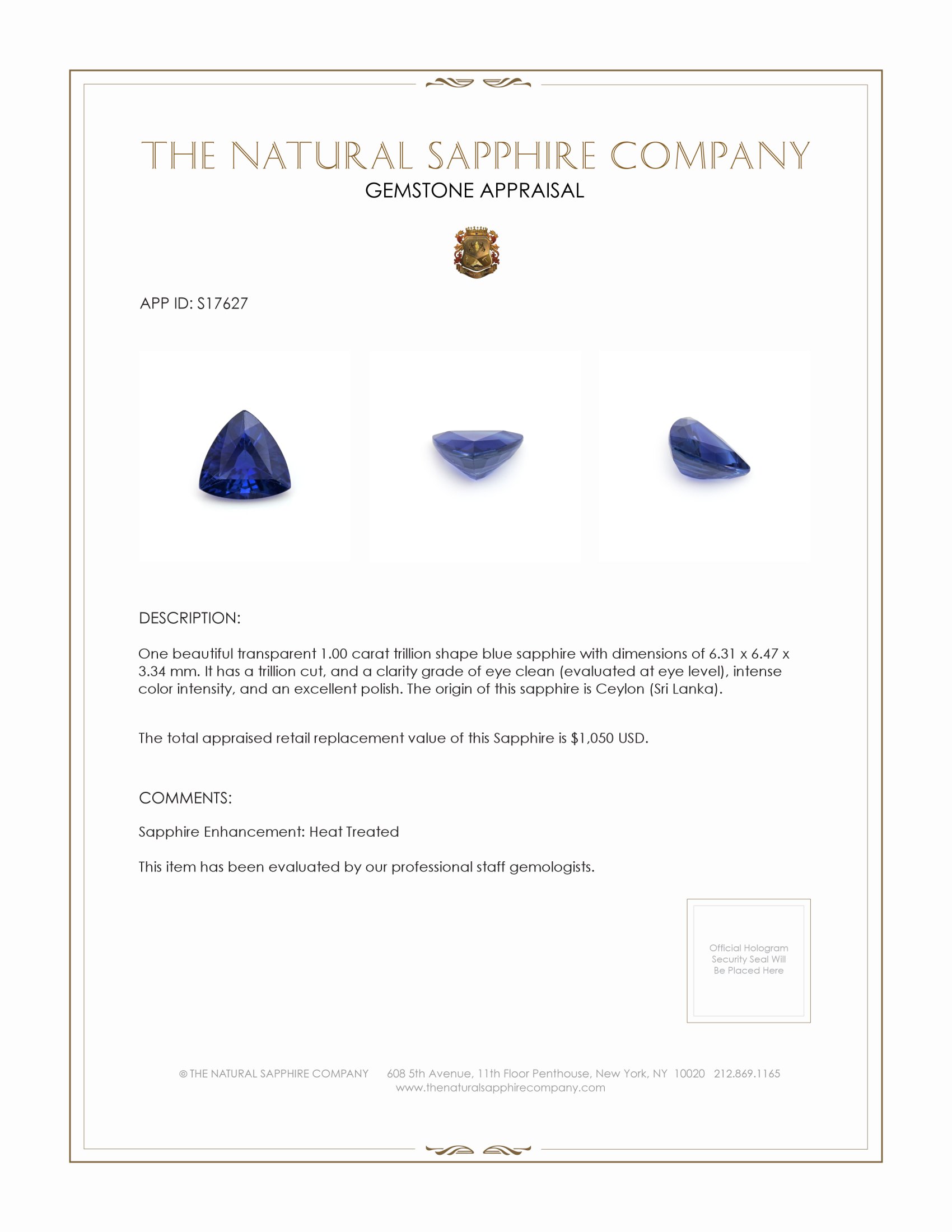 The arduous path from the depths of Ceylon’s rich soil to the light of day allows this sapphire to become a testament to the skill and dedication of the local artisans. Their expert hands transform the raw gem into a beautifully crafted trillion shape, measuring precisely 6.31 by 6.47 by 3.34 millimeters. With each facet polished to perfection, this gemstone tells a tale of human ingenuity and mastery. The artistry involved in shaping the sapphire's trillion cut enhances its natural radiant intensity and ensures it sparkles with an unmatched brilliance, captivating all who lay eyes upon it.