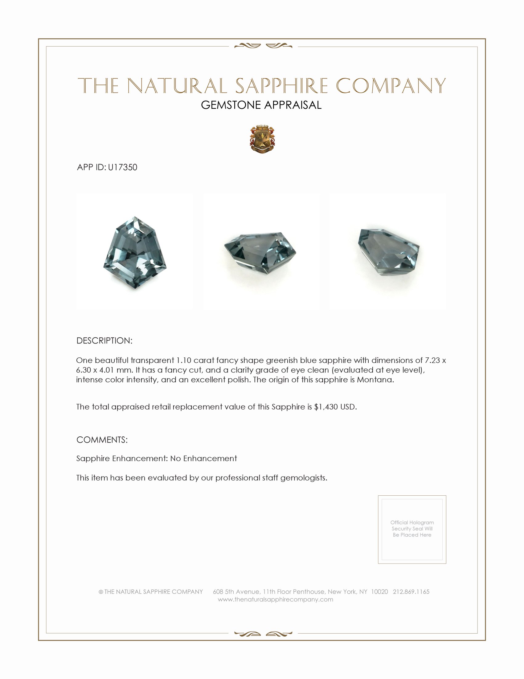 In the embrace of nature's poetic palette lies a gem of mesmerizing allure, a testament to passion and the celestial dance of colors. The fancy shape greenish blue sapphire, weighing a resplendent 1.10 carats, evokes whispers of ancient oceans and untamed skies in its enchanting depths. With dimensions of 7.23 x 6.30 x 4.01 mm, it presents itself as a canvas of wonder, where dreams and desire intermingle in a harmonious ballet of hues.