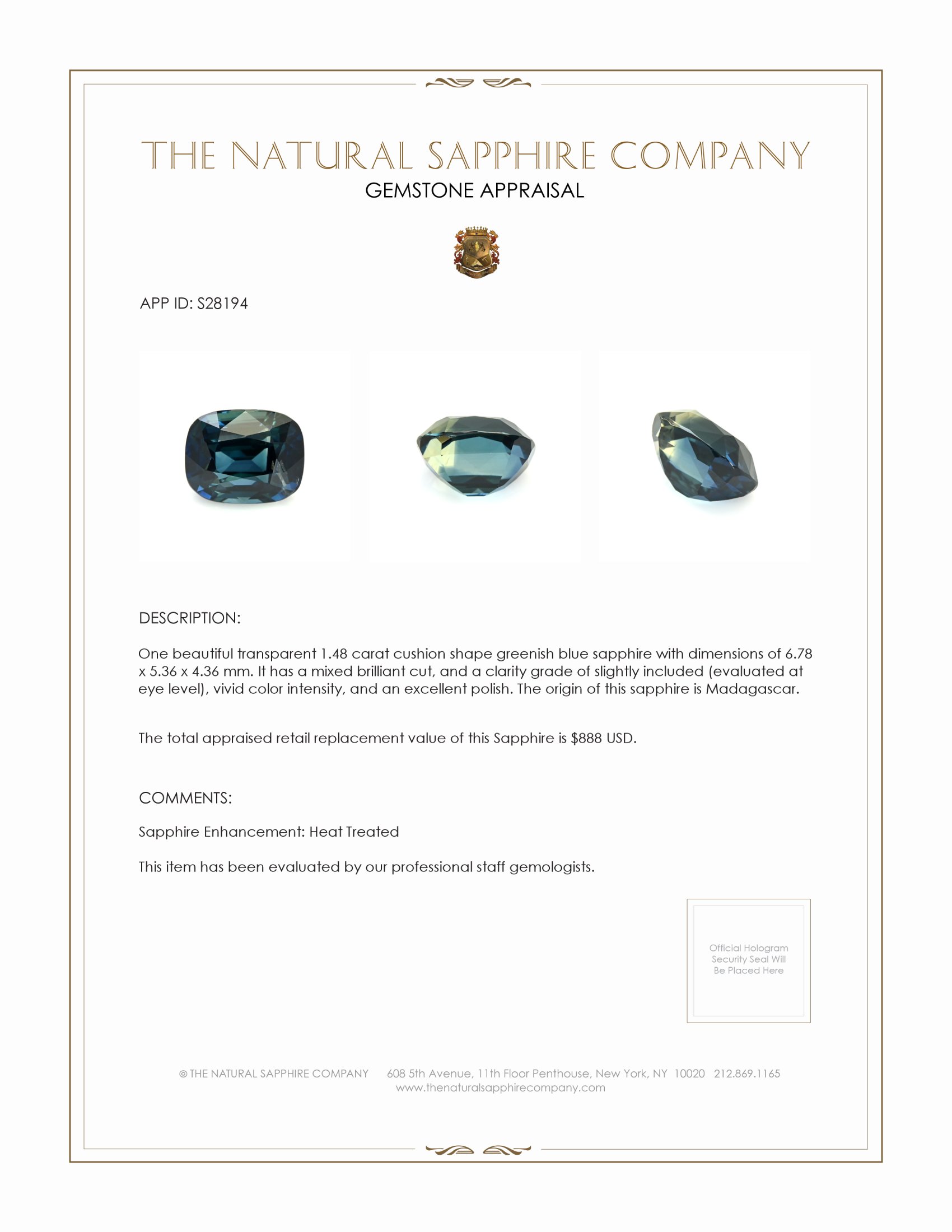 Imagine a moment of sheer delight when you hold a sparkling treasure that seems to capture the essence of nature’s profound beauty—a 1.48 carat gemstone bathed in the alluring hues of greenish blue. This exquisite cushion-shaped sapphire, offered by The Natural Sapphire Company, carries with it the allure and mystique of its Madagascar origins. Each facet whispers stories of the earth and sky, evoking feelings of joy and wanderlust as you gaze into its depths. Perfect for those who cherish meaningful adornments, this sapphire promises to become a cherished piece that tells tales of elegance and timeless style.