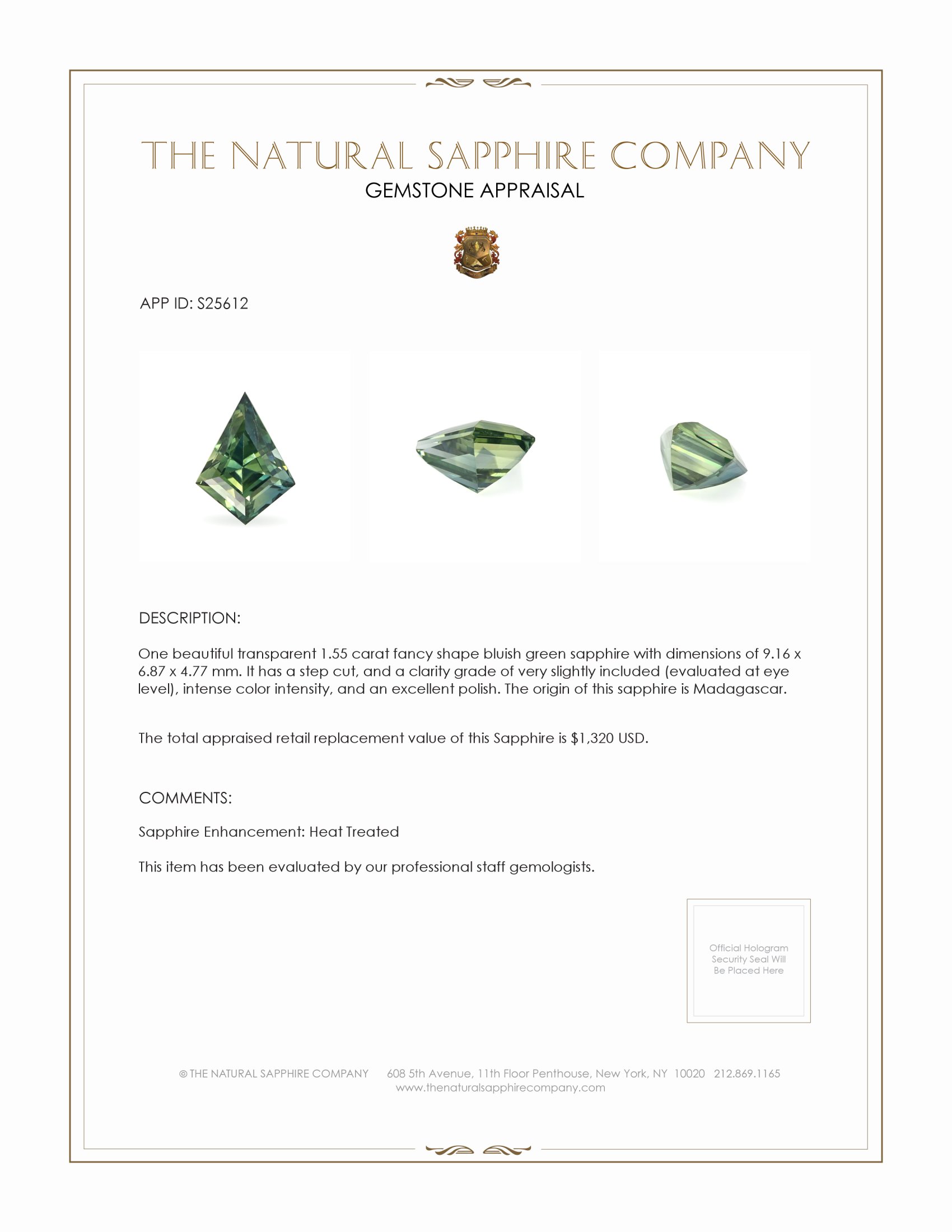 Imagine the moment you lay eyes on our exquisite transparent 1.55 carat fancy shape bluish green sapphire, an exceptional gem that transcends mere beauty to become a symbol of nature’s most vibrant wonders. The Natural Sapphire Company proudly presents this gem as a cornerstone of your conscious collection, offering not just unmatched elegance, but a profound connection to our Earth’s pristine offerings. With its exquisite step cut bringing forth a dazzling dance of light and color, this sapphire is more than a jewel; it is an experience waiting to unfold, a memory in the making for the beholder.