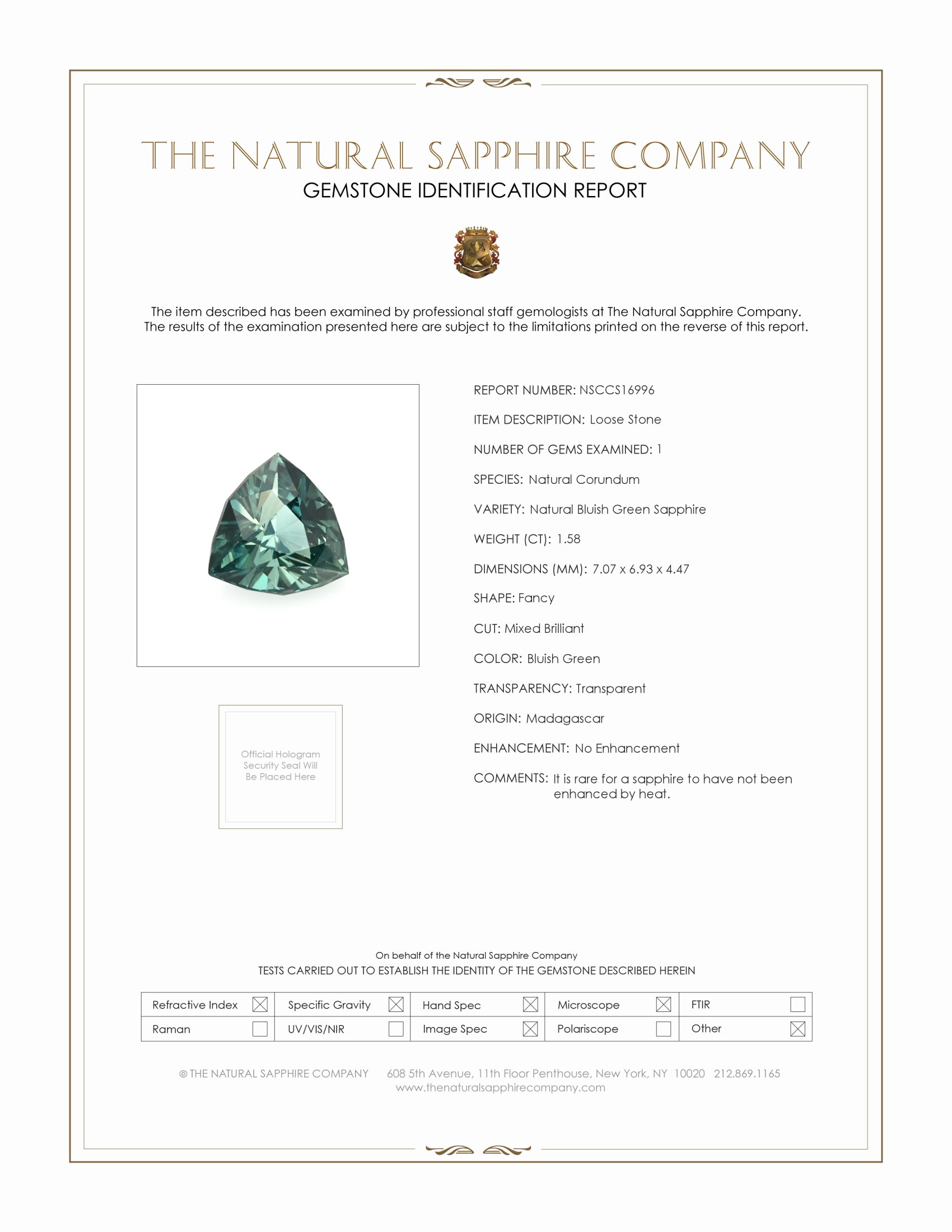 Picture yourself holding a jewel that pulses with the vibrant hues of a tranquil sea on a sunlit day a treasure that can transform not just your collection but also your cherished moments This one beautiful transparent 1.58 carat fancy shape bluish green sapphire offers more than its stunning appearance the dimensions of 7.07 x 6.93 x 4.47 mm capturing every eye that glances upon it Crafted with precision its mixed brilliant cut dazzles with a shimmering play of light revealing the sapphire's true intense color which captivates like an ocean kissed by the dancing rays of the sun Its clarity a grade of very slightly included at eye level enhances the stone's raw beauty without overshadowing its radiant intensity and lets this sapphire whisper stories of its birthplace the mysterious land of Madagascar