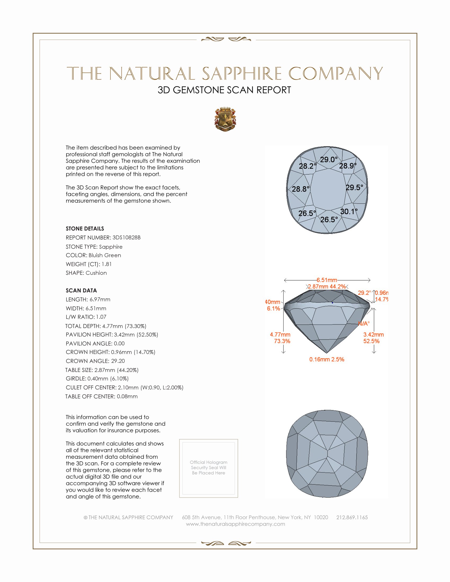 Imagine the exquisite beauty of a gem that captures not only the essence of nature but also the artistry of human craftsmanship. Owning this gemstone is more than possessing a piece of luxury; it is embracing a timeless treasure that transforms everyday moments into unforgettable memories. This 1.81 carat cushion-shaped bluish green sapphire stands as a testament to beauty refined by nature’s hand and perfected by world-class craftsmanship. Its dimensions, 6.97 by 6.51 by 4.77 millimeters, create a stunning balance that catches the light from every angle, promising a breathtaking display of brilliance.
