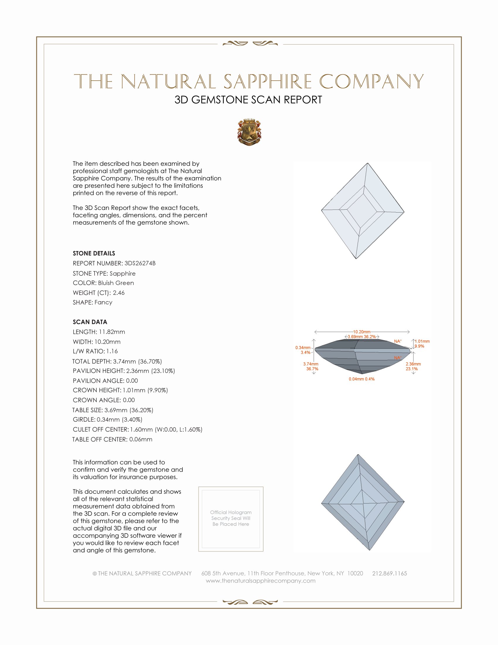 In the vibrant world of gemstones, where beauty and rarity often intertwine, our 2.46-carat bluish-green sapphire stands apart as a rare treasure, heralding both elegance and exclusivity. This stunning gem, crafted in a fancy shape, is not merely a decorative piece but an extraordinary work of nature. Its dimensions, measuring 11.82 x 10.20 x 3.74 mm, set it decorously in a tier of its own, comparable to far fewer gemstones in its class. While sapphires are generally lauded for their deep blues or sparkling pinks, this particular jewel captivates with its unique bluish-green hue, a rarity that echoes the deep mysteries of nature itself. It challenges the conventional perceptions of beauty by merging the calming serenity of blue with the refreshing vibrancy of green, resulting in an entirely unique and alluring appeal.