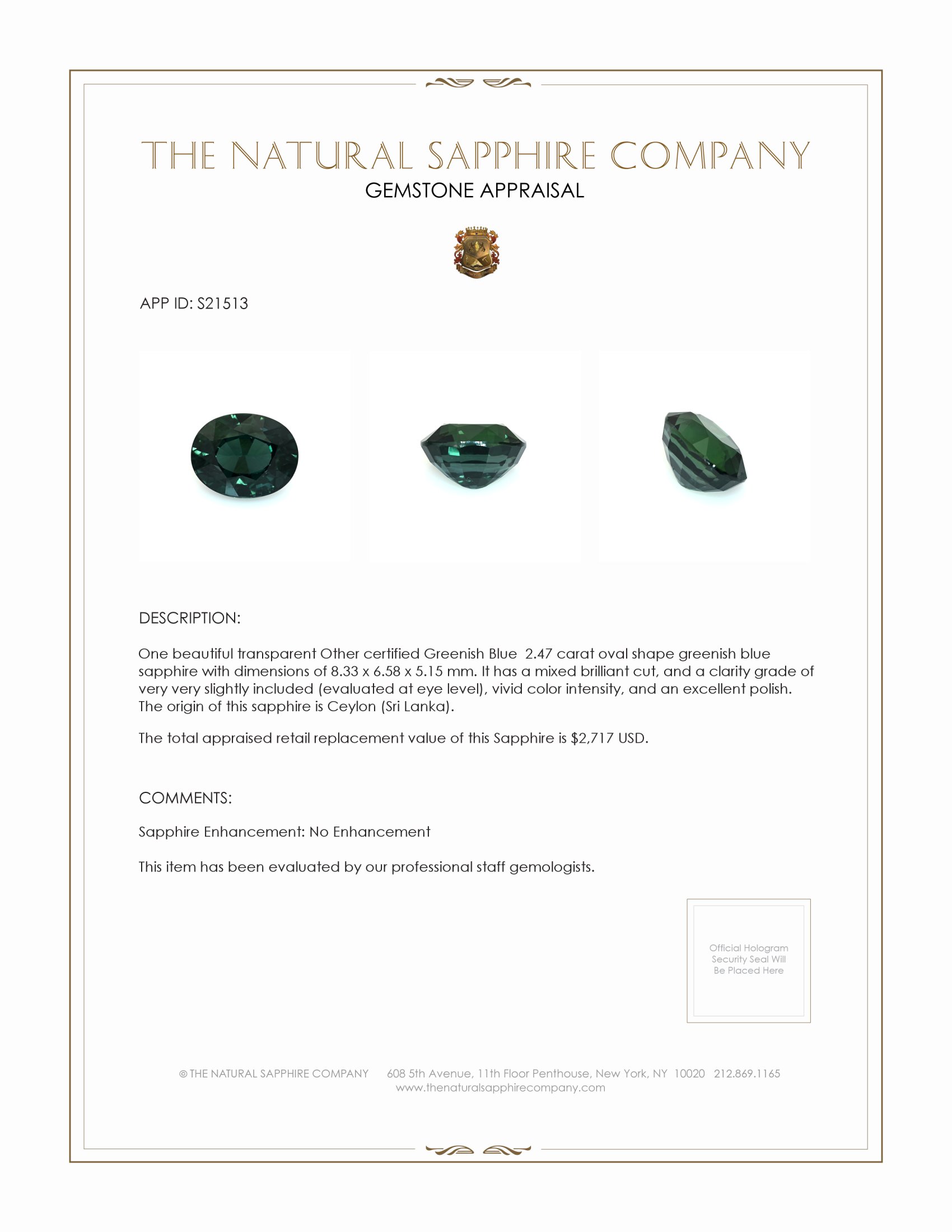 Embark on a journey to find the perfect piece that encapsulates elegance and rarity. At The Natural Sapphire Company, we present a truly remarkable gem that meets both the discerning tastes of collectors and those seeking an unforgettable engagement ring. This exquisite transparent Other certified 2.47 carat oval shape greenish blue sapphire is a testament to natural beauty and skilled craftsmanship. With dimensions that create a captivating presence of 8.33 x 6.58 x 5.15 mm, this gemstone is the epitome of finesse. Its mixed brilliant cut enhances its inherent sparkle, ensuring that it captures light and attention from every angle.