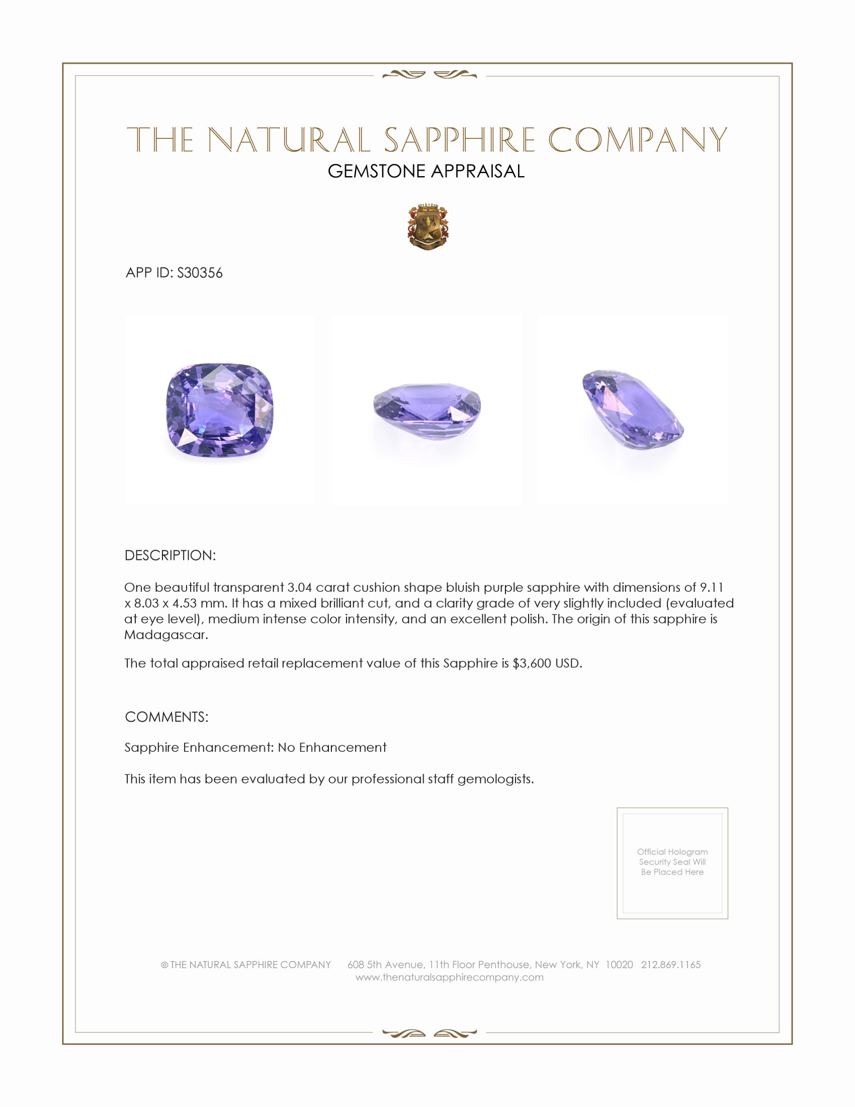 This exquisite transparent 3.04 carat cushion shape bluish purple sapphire measures 9.11 x 8.03 x 4.53 mm, and is cut with a mixed brilliant design to maximize scintillation and depth of color. The medium intense color presents a balanced bluish purple that reads vividly under natural light, and the excellent polish offers crisp facet junctions and clean light return. Clarity is described as very slightly included when evaluated at eye level, which means the stone appears clean to the naked eye with only minor inclusions detectable under magnification, an attribute that preserves both the visual purity and durability of the gem. This sapphire is completely natural and untreated, with no enhancement, a quality that materially increases its rarity and long term value. Origin is Madagascar, a source known for producing a wide range of fine colored sapphires with lively saturation and attractive crystal clarity, and this provenance contributes directly to the gemological and market appeal.