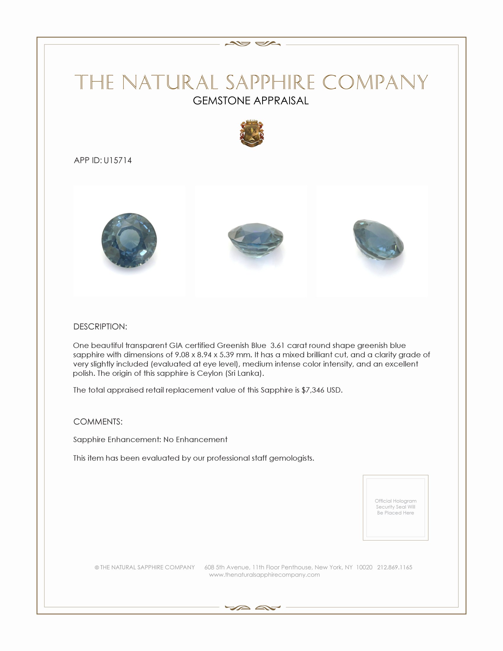 In the realm of unspoken elegance and timeless luxury, stands a masterpiece of nature's artistry, a visual symphony that promises the beholder admiration and accolade. This exquisite gem is none other than a captivating greenish blue sapphire, certified by the renowned GIA, bearing testimony to its enviable authenticity. With a robust weight of 3.61 carats, its round shape measures an impressive 9.08 by 8.94 by 5.39 millimeters, embodying a perfect blend of size and grace. Hailing from the legendary mines of Ceylon, modern-day Sri Lanka, the origin of this sapphire whispers tales of ancient craftsmanship and lands steeped in history.