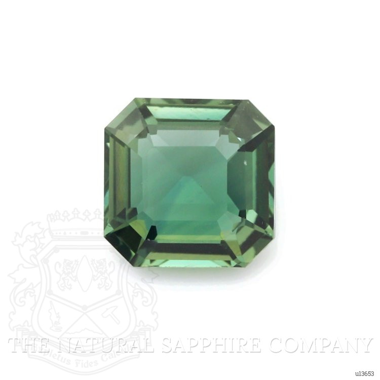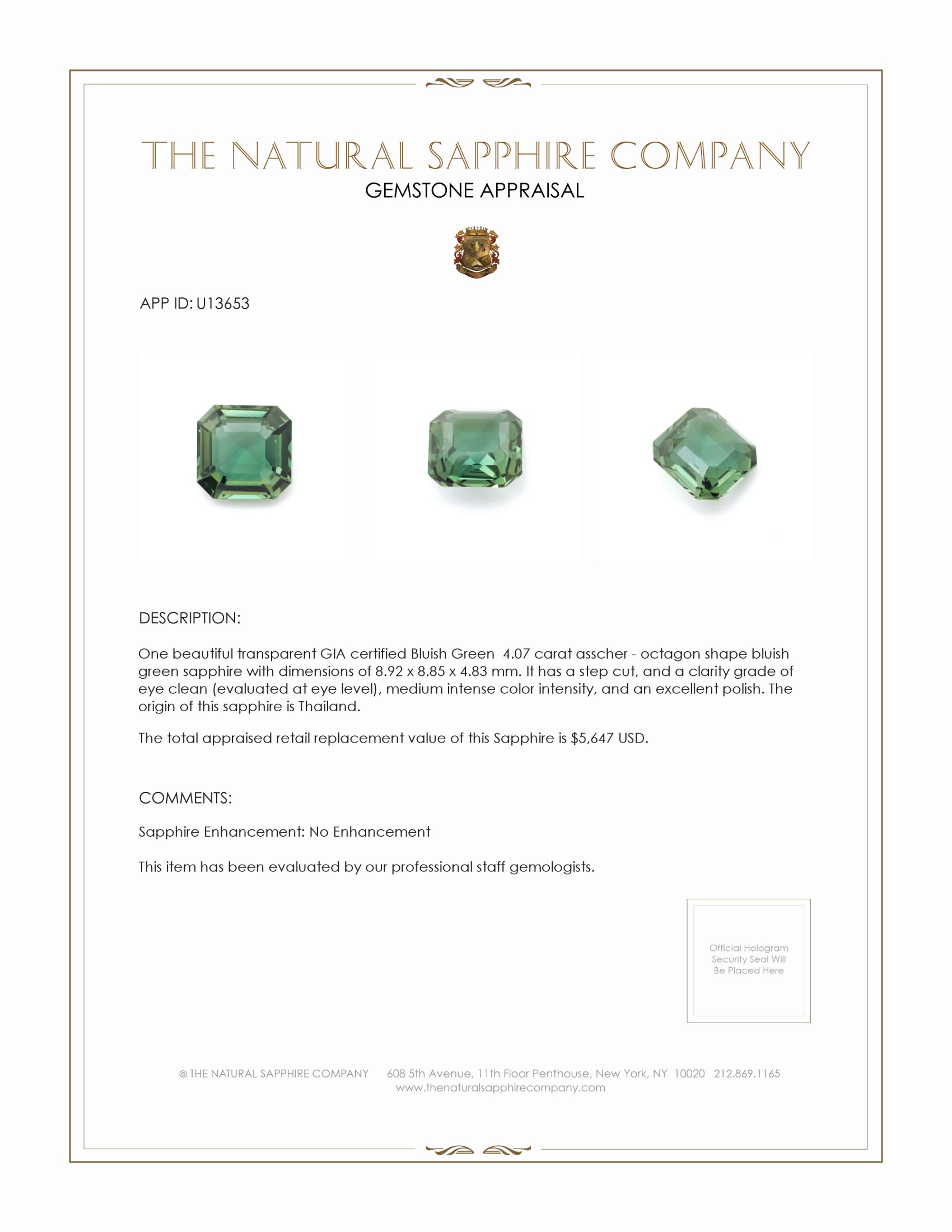 Blessed with a substantial weight of 4.07 carats, this sapphire commands attention with its striking asscher, or octagon, shape. At dimensions of 8.92 x 8.85 x 4.83 mm, the gem demands to be noticed, with a presence that speaks of its magnificence and exudes a timeless charm. The step cut employed in its crafting unveils a labyrinth of intricate facets that create a striking interplay of light and shadow. Each face of the sapphire is like a window into the ocean depths, offering endless opportunities to immerse oneself in its tumultuous hues of bluish green.